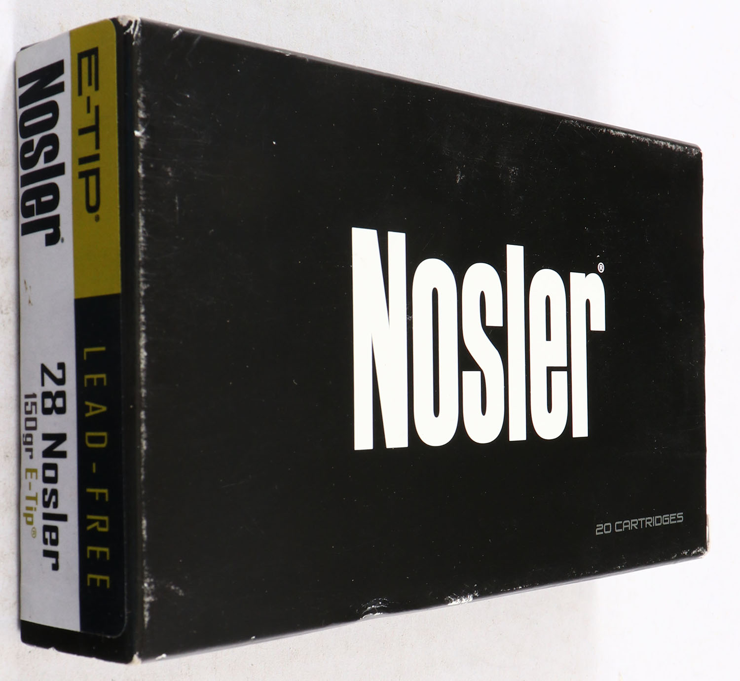 Nosler, E-TIP Lead-Free, 28 Nosler, 150 Grain, Full, 1pc. multi-colored box, box is solid with excellent color, Ammo is excellent. Grade: Excellent ++ - Value: 20 to 80