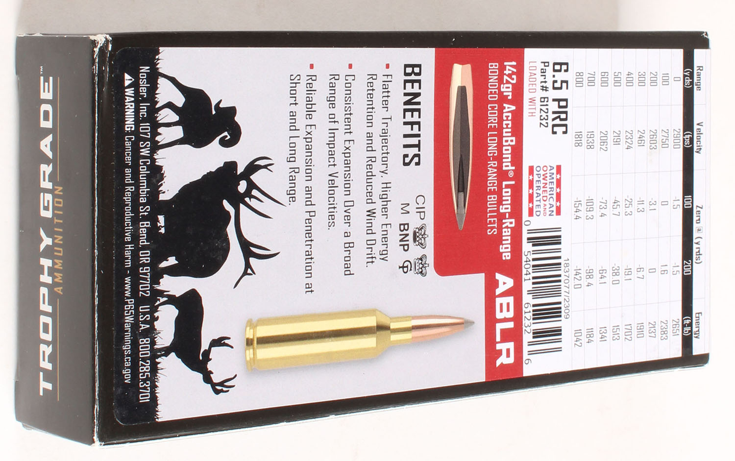 Nosler, Trophy Grade, 6.5 PRC, 142 Grain ABLR, Full, 1pc. multi-colored box, box is solid with excellent color, Ammo is excellent. Grade: MINT - Value: 20 to 80