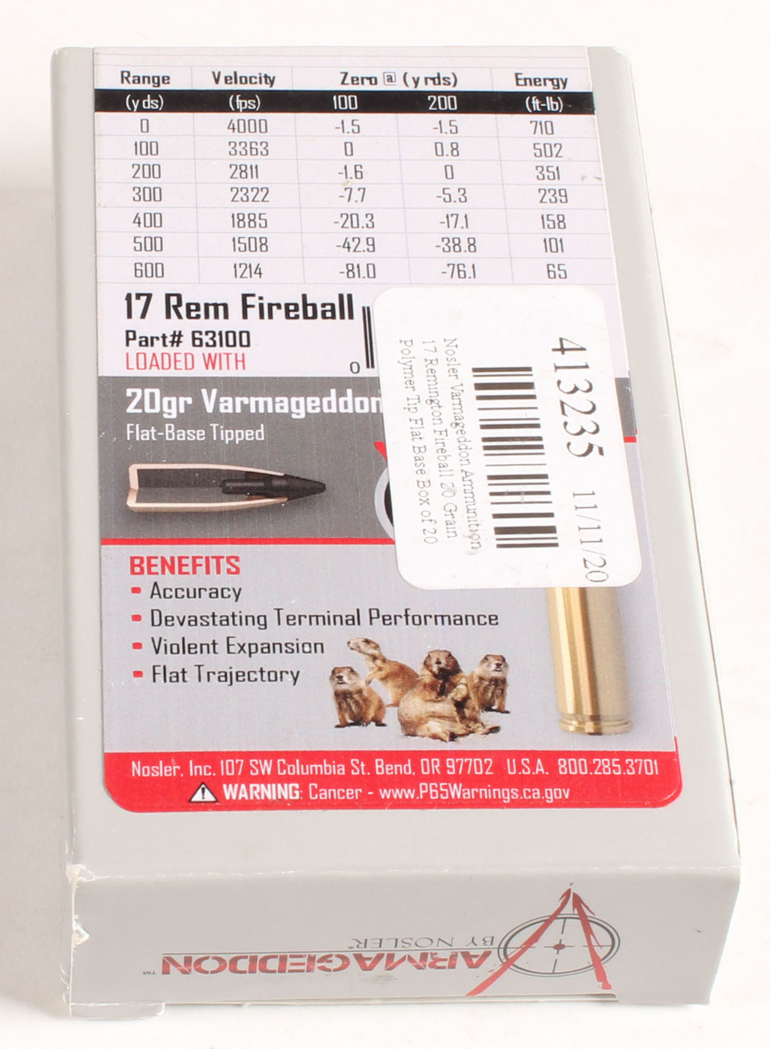 Nosler Armageddon, .17 Rem Fireball, 20 Grain FB Tipped, Full, 1pc. multi-colored box, box is solid, Ammo is excellent. Grade: MINT - Value: 16 to 50