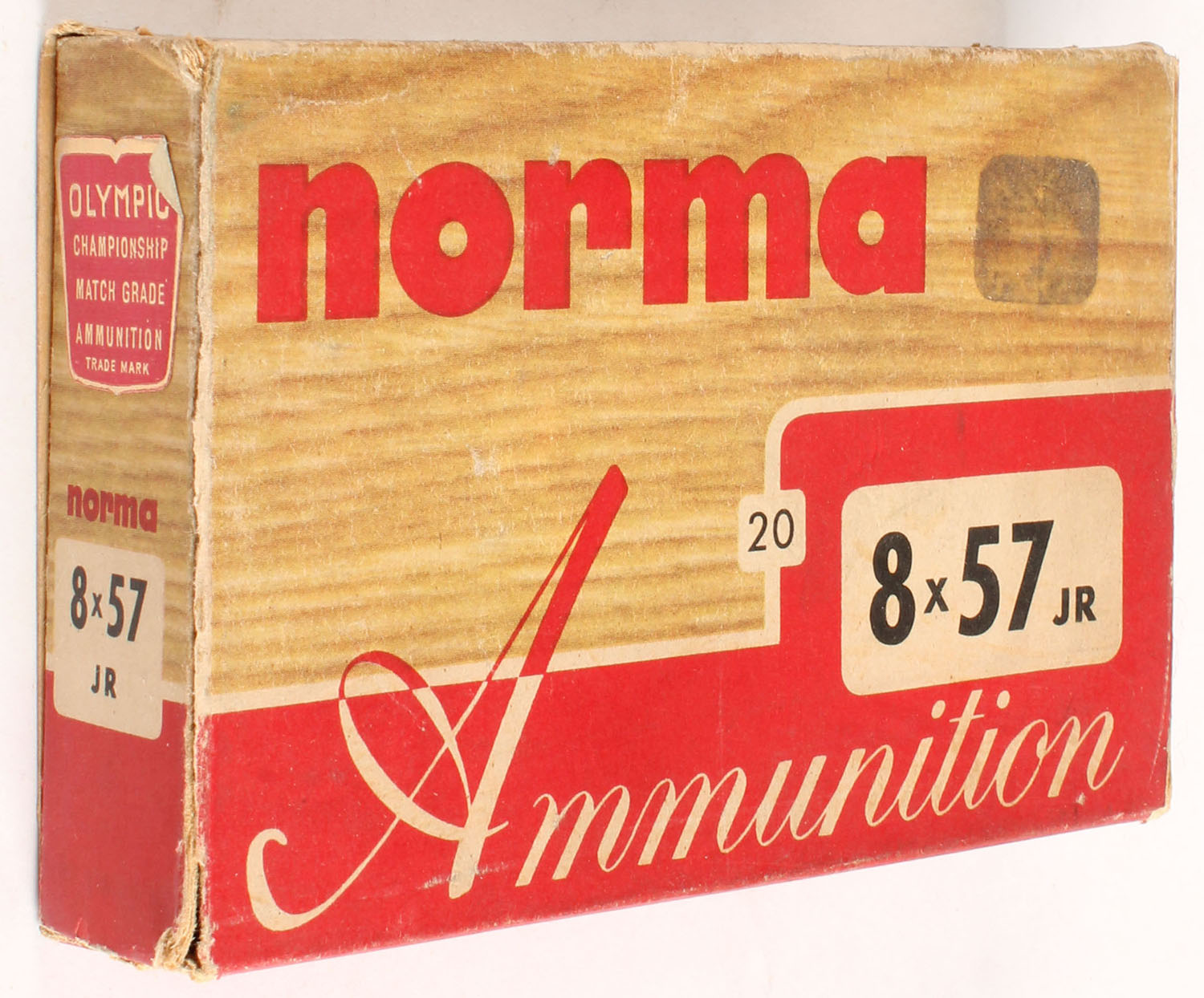Norma, 8 x 57 JR., 196 Grains SP, Partial 19rds, 1pc. multi-colored box, box has torn left flap, Ammo is very good. Grade: Very Good + - Value: 10 to 50