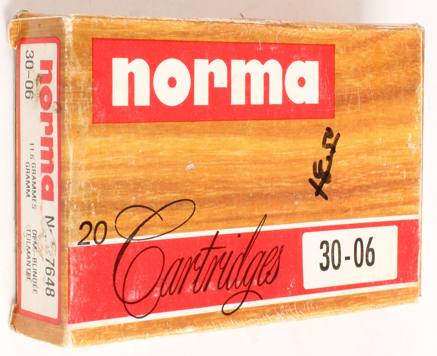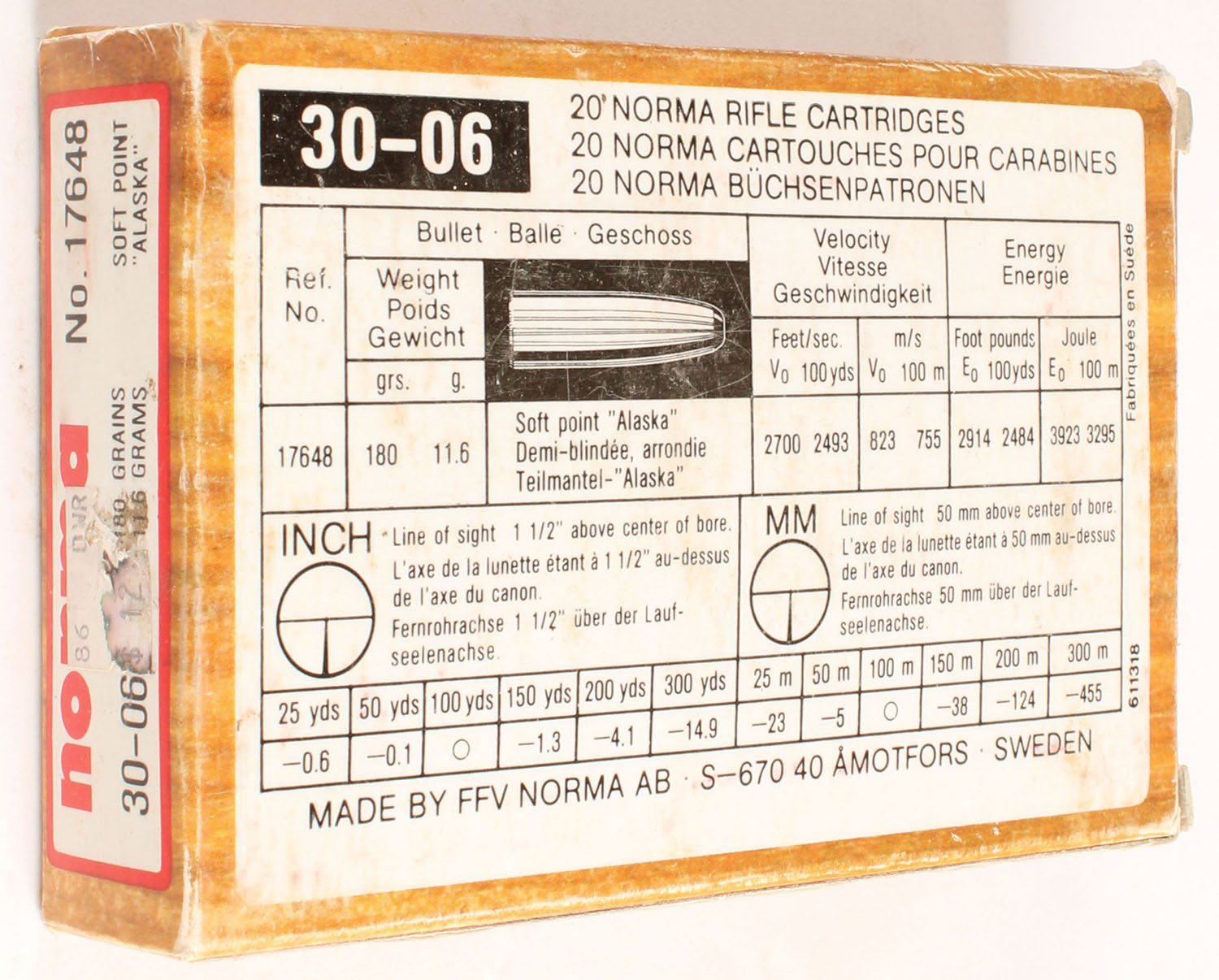 Norma, 30-06, 180 Grains SP ''ALASKA'', Full, 1pc. multi-colored box, box is solid with age soiling, Ammo is excellent. Grade: Very Good ++ - Value: 20 to 60