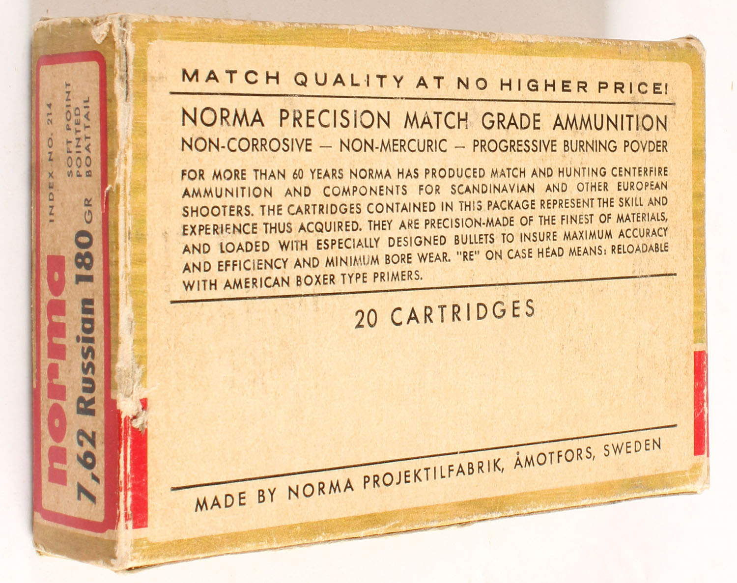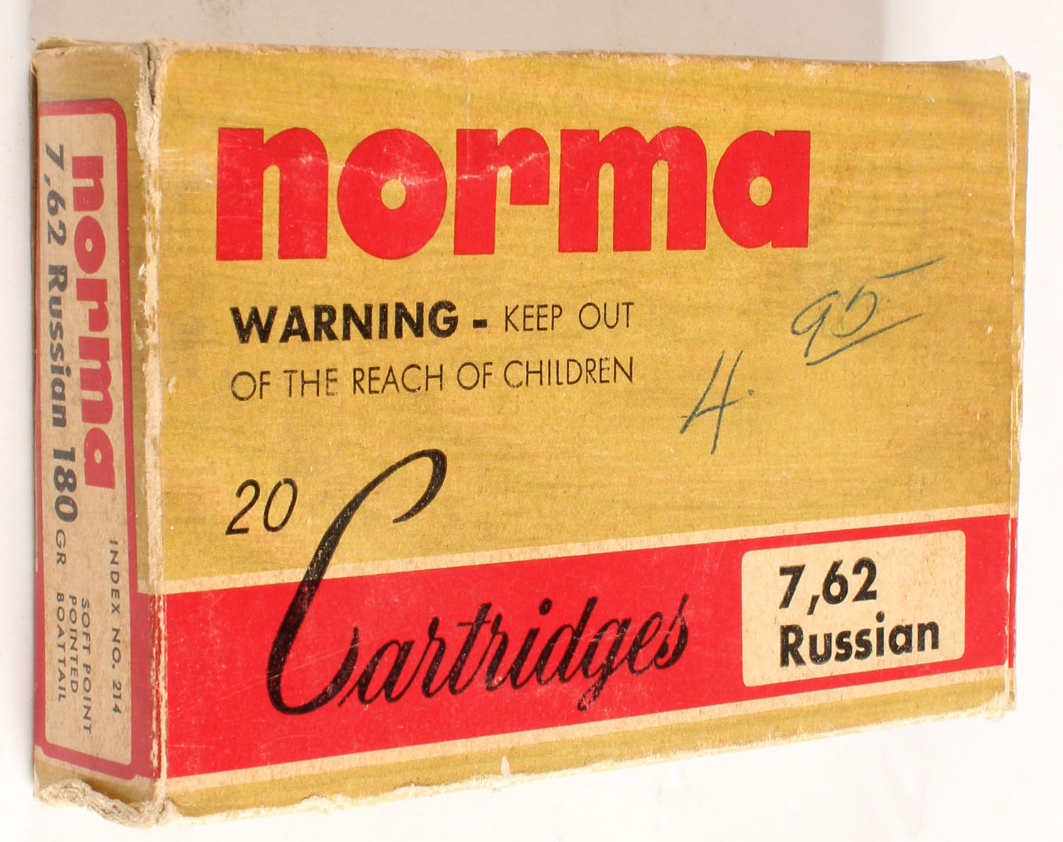 Norma 7.62 RUSS., 180 Grain Soft Point, Full, 1pc. Box is very solid, multi-colored box, Ammo is very good. Grade: Very Good ++ - Value: 16 to 50