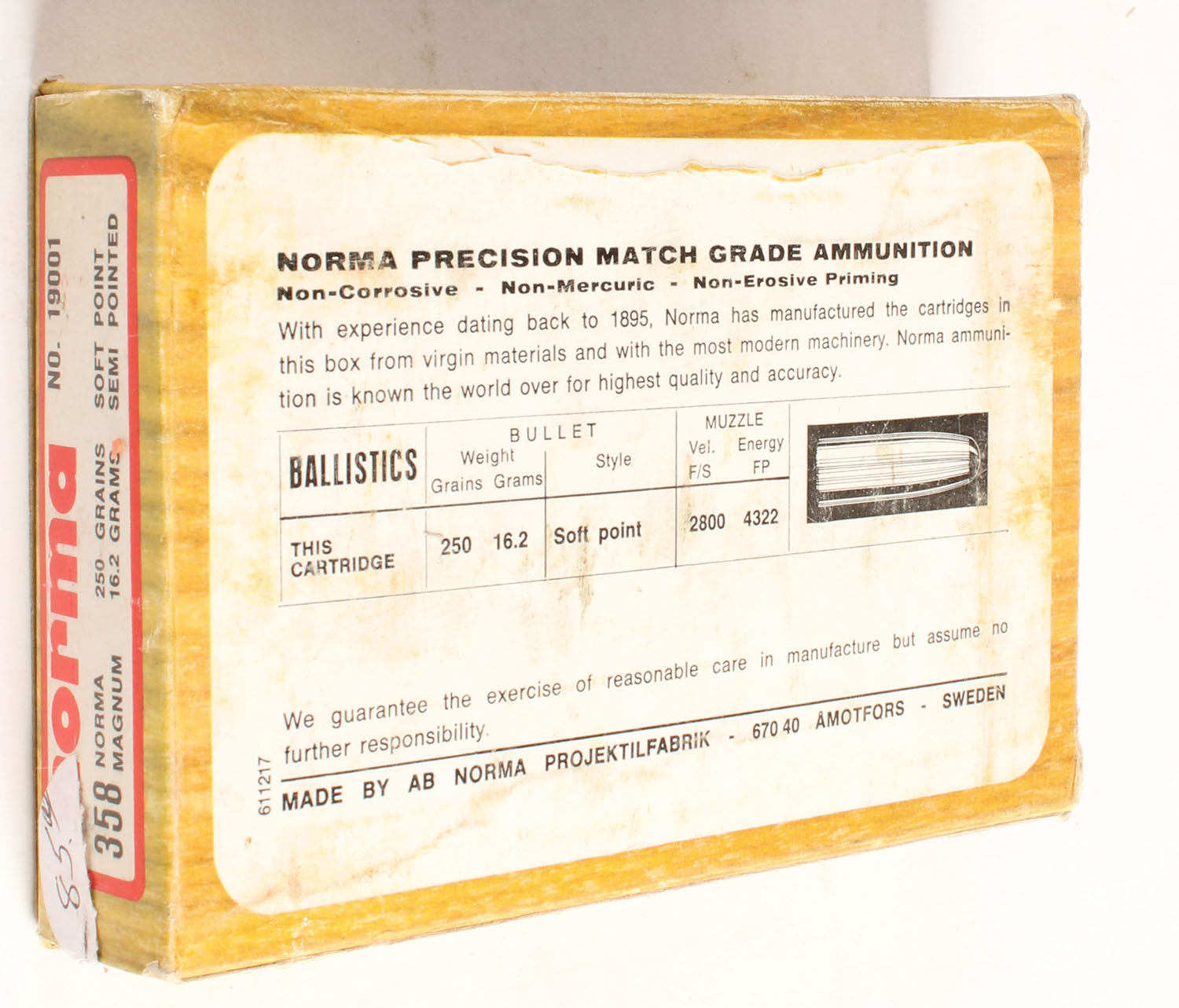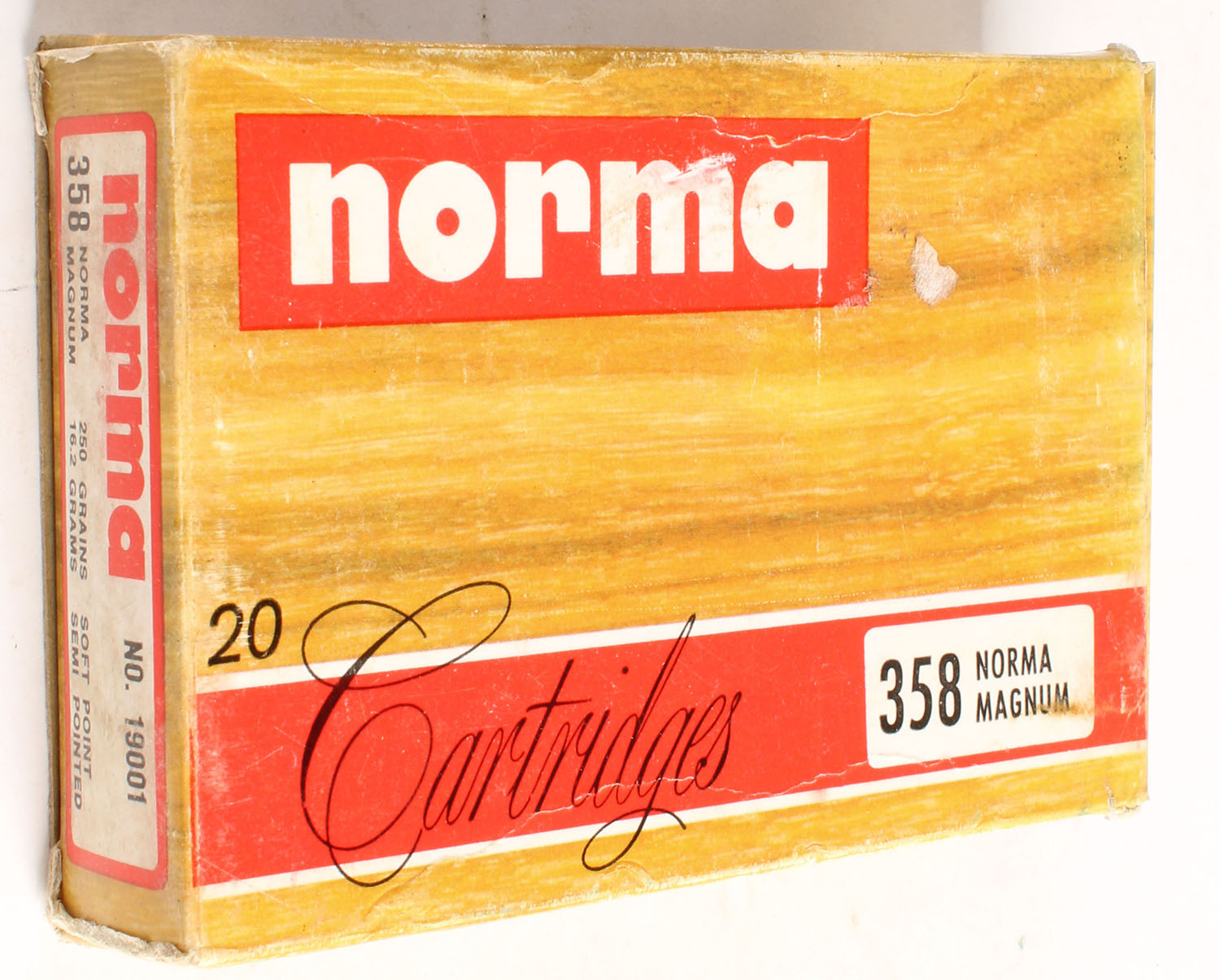 Norma, 358 Norma Magnum, 250 Grains Soft Point, Full, 1pc. multi-colored box, box is solid, Ammo is excellent. Grade: Very Good ++ - Value: 20 to 60