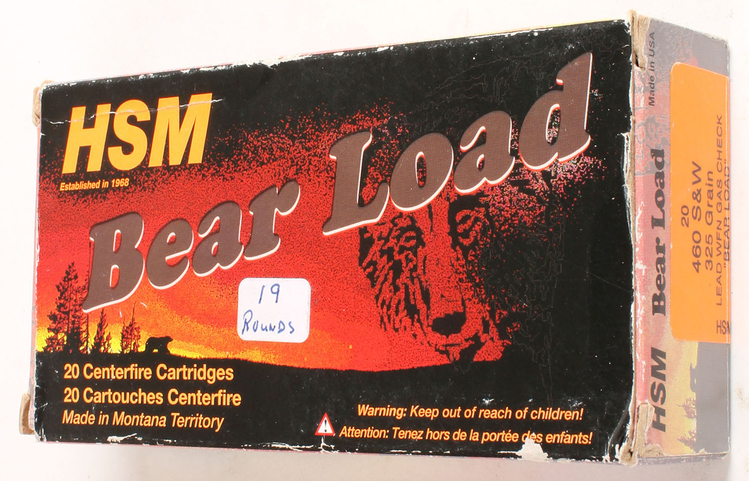 HSM, BEAR LOADS, 460 S&W, 325 Grain LEAD WFN Gas check ''Bear Load'', Partial 19rds, 1pc., multi-colored box, box is solid, Ammo is very good. Grade: Very Good ++ - Value: 10 to 40