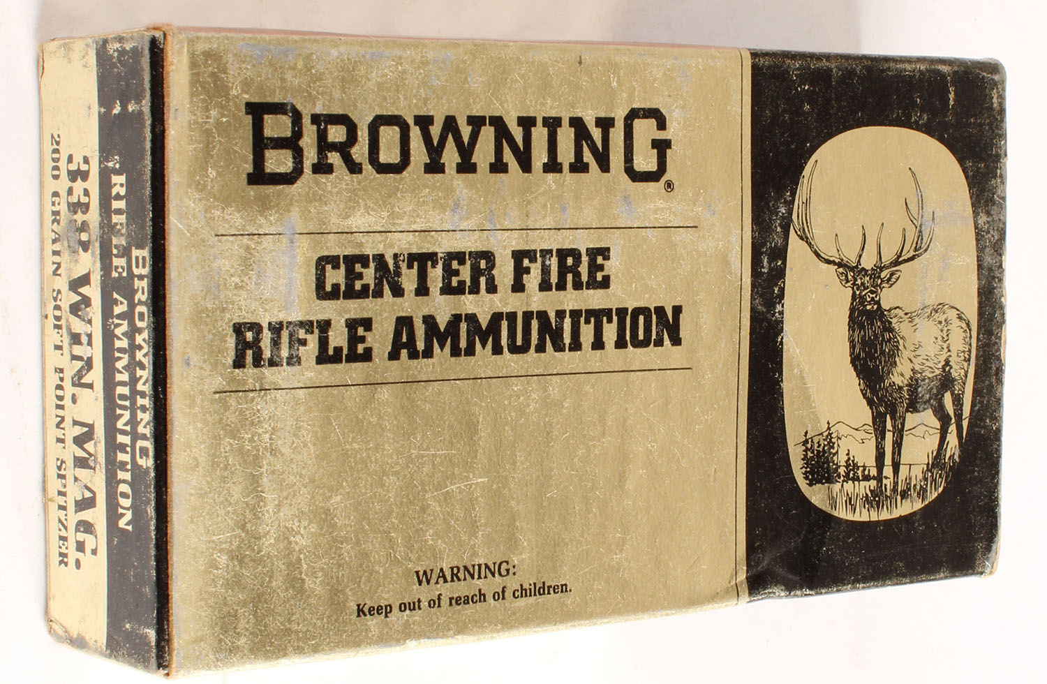 Browning, .338 Win Mag, has paper insert, 200 Grain Soft Point Spitzer, Partial 13rds, 1pc., multi-colored box, box is solid with shelf wear, Ammo is excellent. Grade: Very Good ++ - Value: 20 to 60