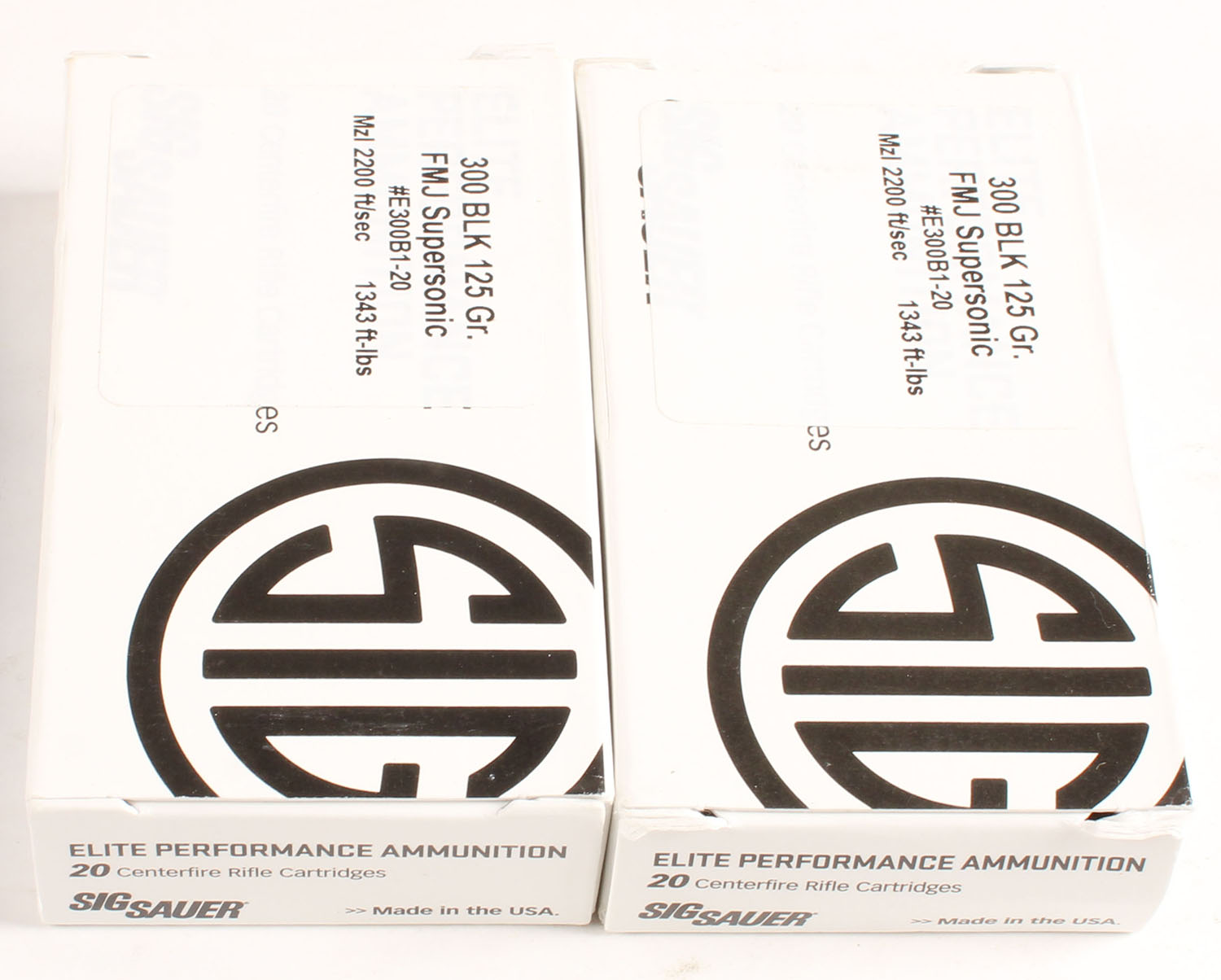 Sig Sauer, Lot of 2, Elite Performance, .300 BLK., 125 Grain FMJ Supersonic, Full, 1pc. multi-colored box, box is solid, Ammo is excellent. Grade: Excellent ++ - Value: 16 to 40