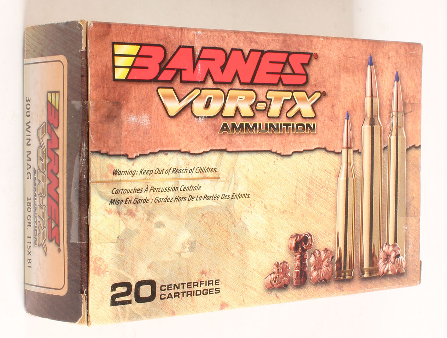 Barnes, VOR-TX, 300 WIN MAG, 180 Gr. TTSX BT, Full, 1pc. multi-colored box, box is solid with excellent color, Ammo is excellent. Grade: Excellent + - Value: 20 to 80