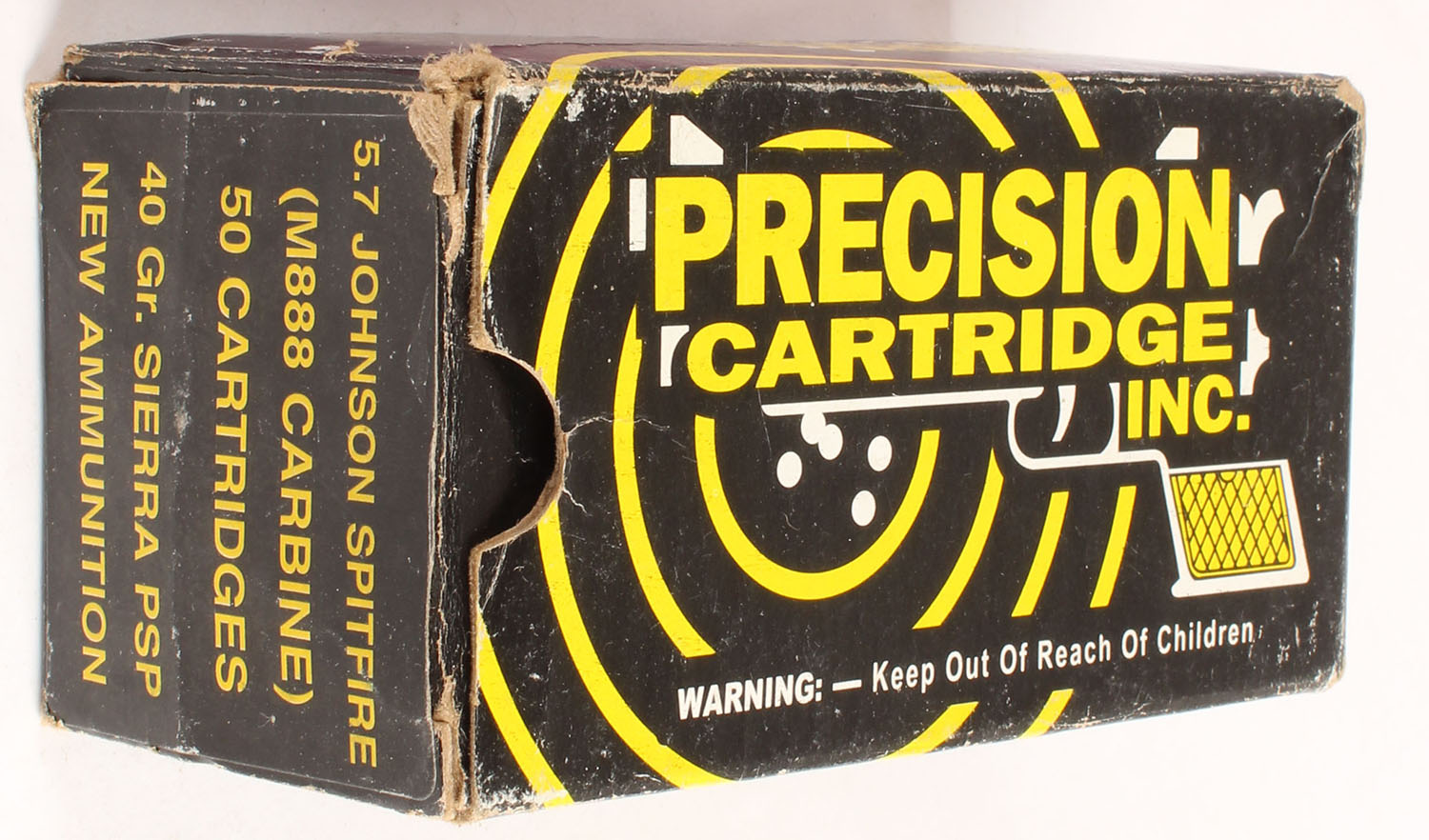 RARE! Precision Cartridge Inc. 5.7 Johnson Spitfire, (M888 Carbine), 40 Gr. Sierra PSP, Full, 1pc., multi-colored box, box has scuffing, ammo is excellent. Grade: Very Good ++ - Value: 50 to 200