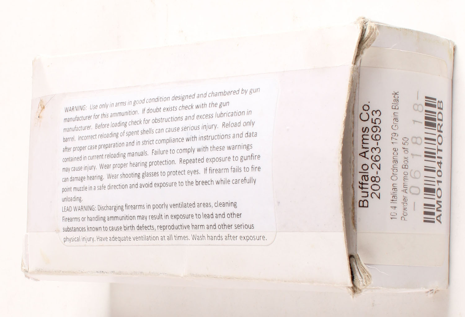 Buffalo Arms Co., 44 S&W Special, 179 Gr. Black Powder, Full, 1pc. White box with label, box is solid, ammo is excellent. Grade: Very Good - Value: 20 to 60