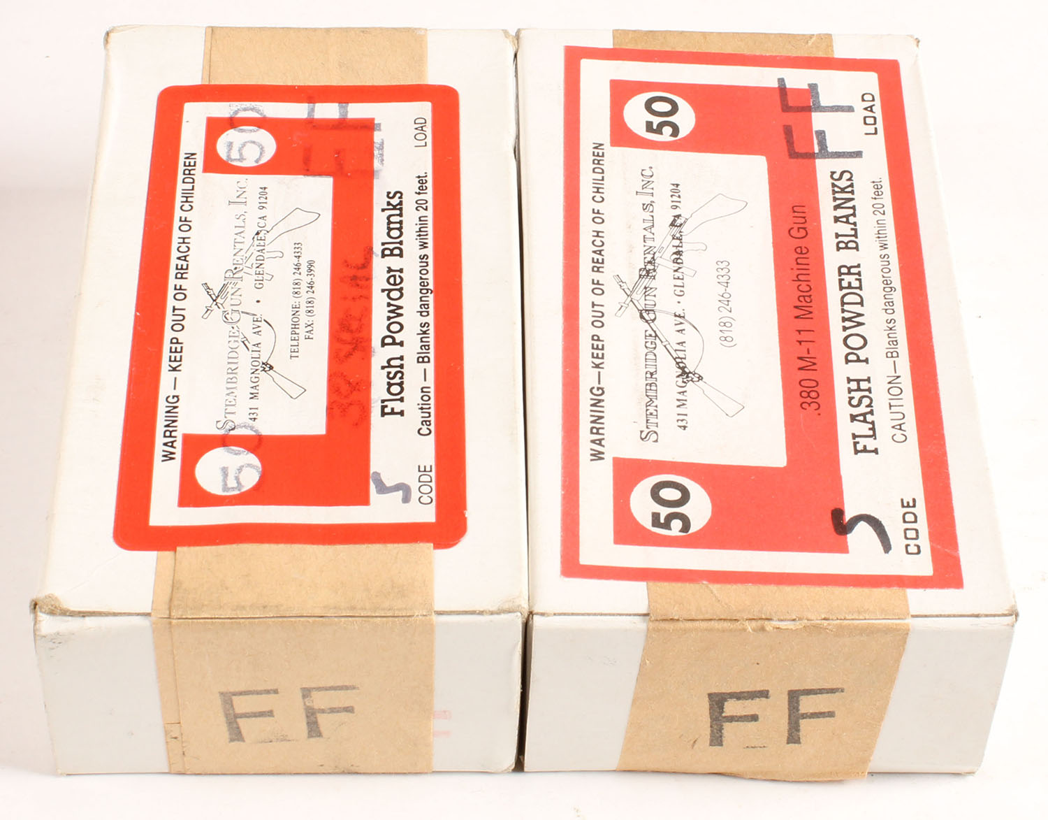 Stembridge Gun Rentals Inc., Lot of 2, .38 Special, Flash Powder Blanks from the famous Hollywood gun rental company, Full, 1pc., multi-colored box, box is solid with great color, ammo is excellent. Grade: Very Good ++ - Value: 20 to 80