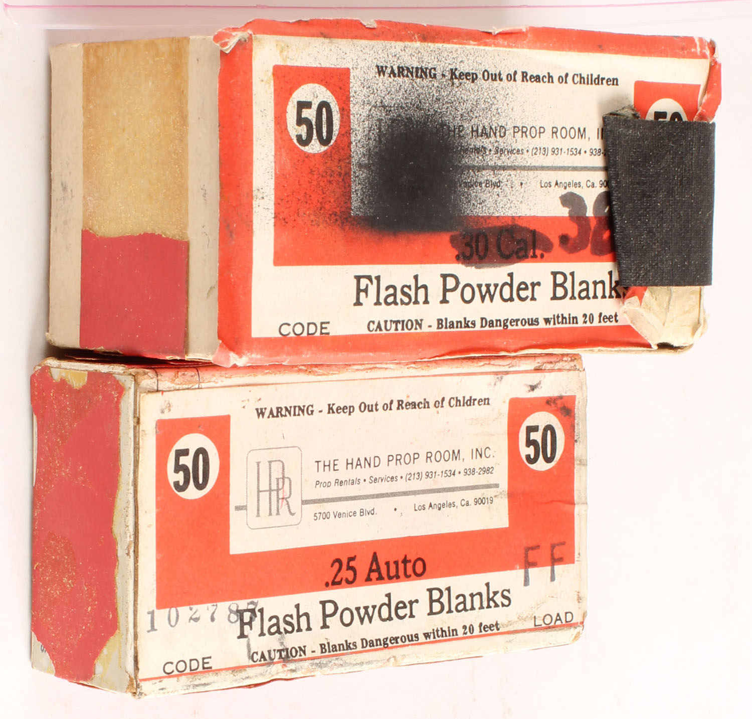 The Hand Prop Room Inc., Lot of 2, .380 & .25 Auto, Flash Powder Blanks, Partial, 1pc., multi-colored box, box is solid with great color, ammo is very good . Grade: Very Good - Value: 10 to 50
