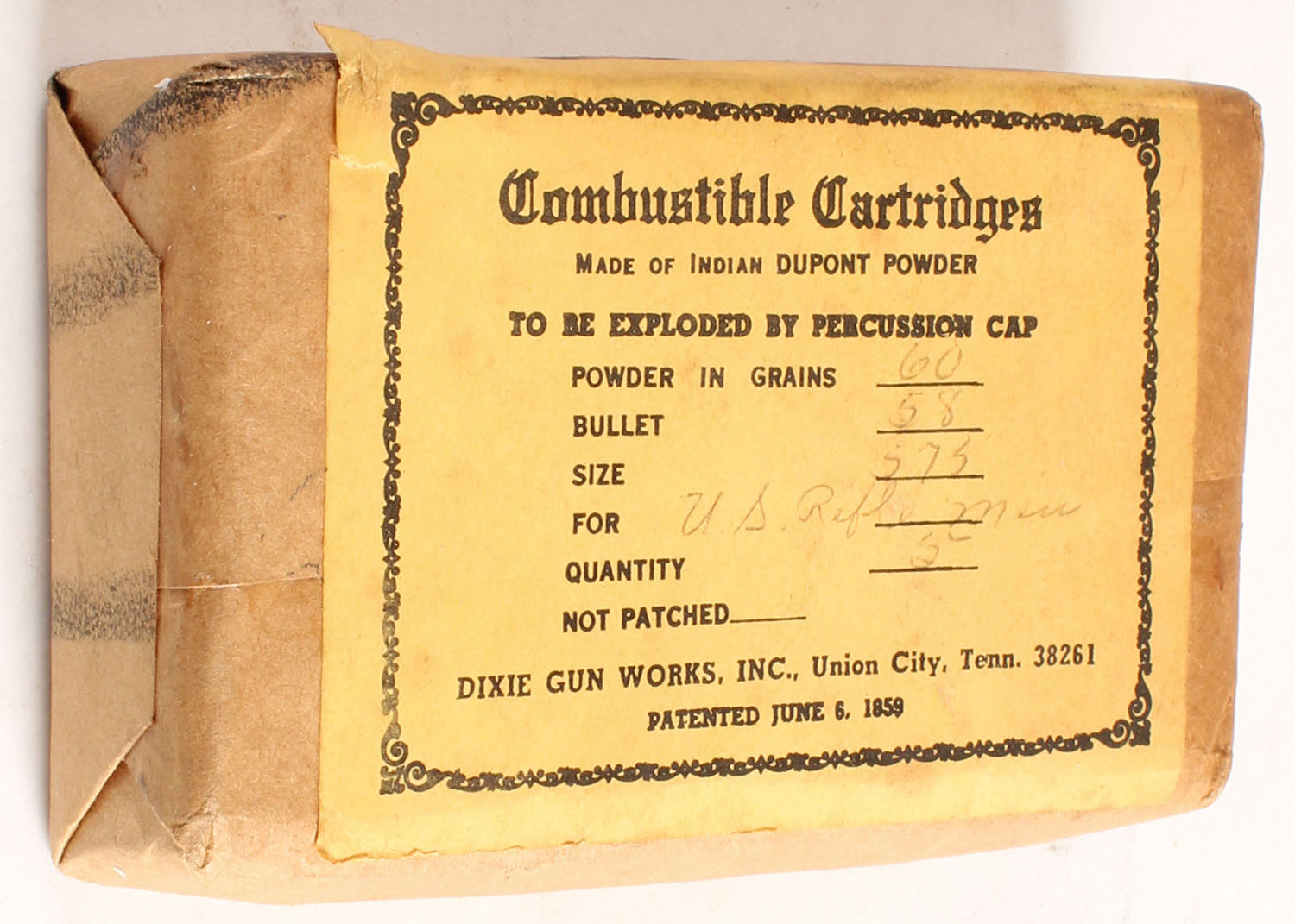 Combustible Cartridges, 60 Gr. Made of Indian DuPont Powder, FULL & SEALED, 1pc. Paper Box is solid with writing to back. Grade: Very Good - Value: 8 to 30
