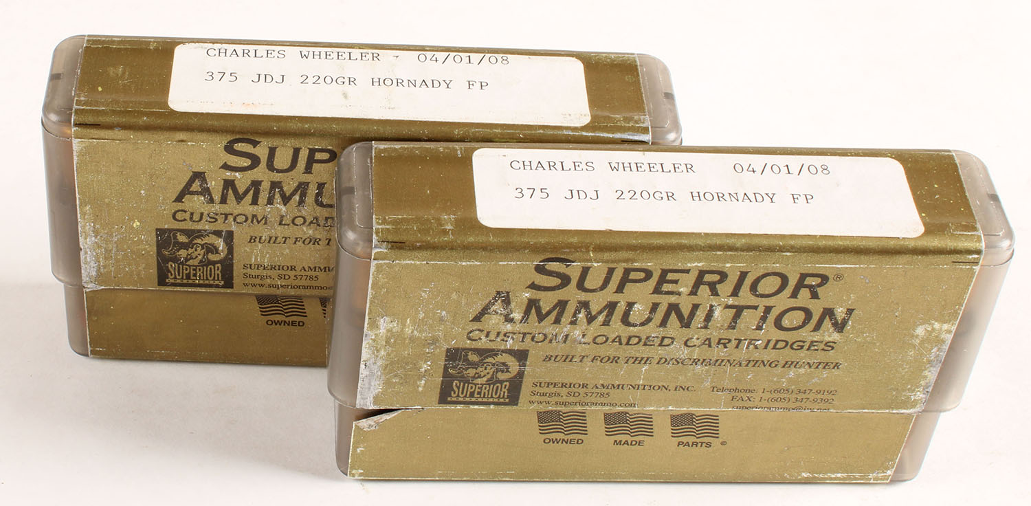 Superior Ammunition, Lot of 2, .375 JDJ, 220 Gr. Hornady F.P., Full, 2 pc. Boxes are very solid, plastic boxes with gold colored label, ammo is very good to excellent. Grade: Very Good ++ - Value: 40 to 100