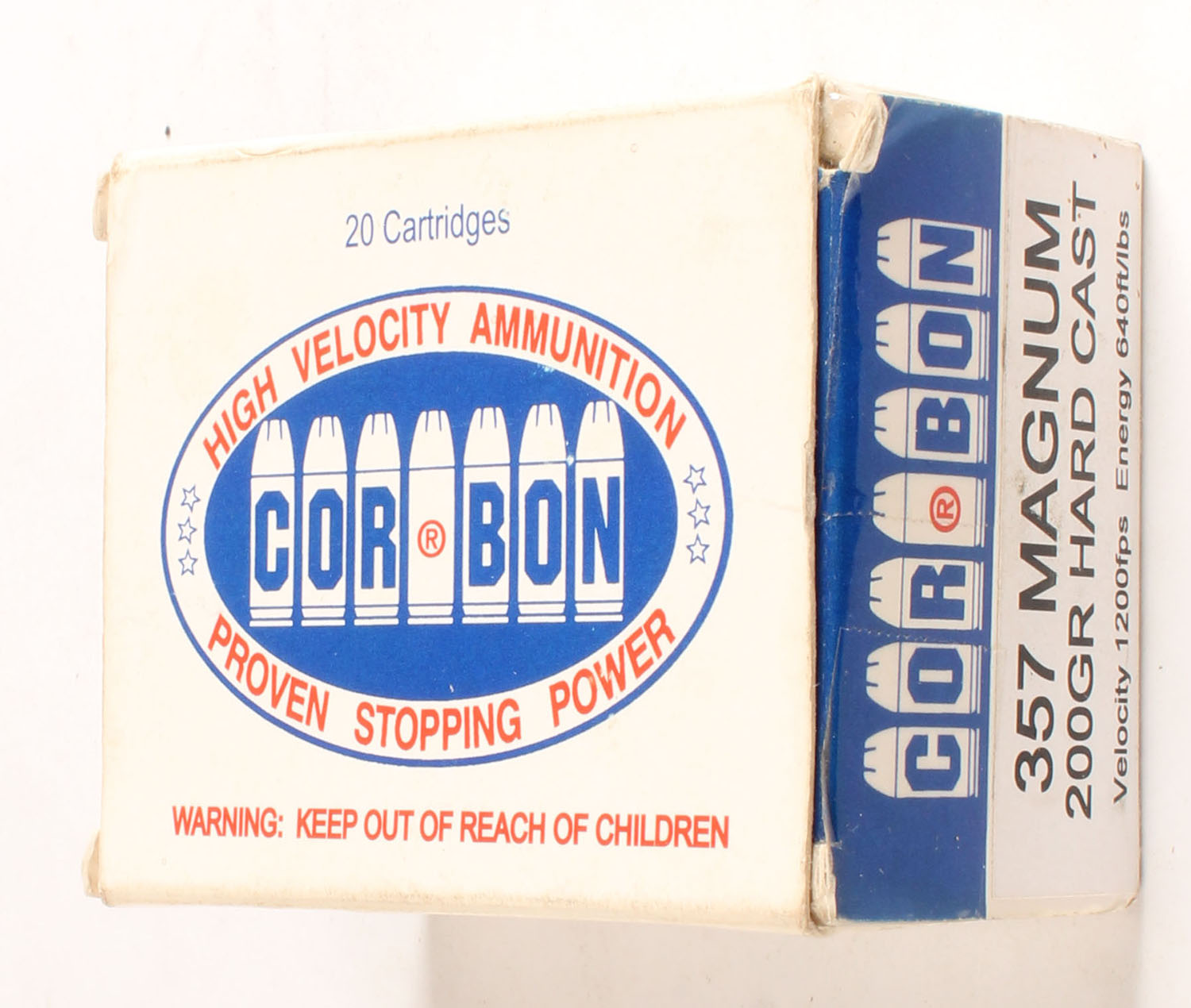 Corbon .357 Magnum, 200 Gr. Hard Cast, Full, 1pc. multi-colored box, box is solid, Ammo is excellent. Grade: Excellent - Value: 16 to 40