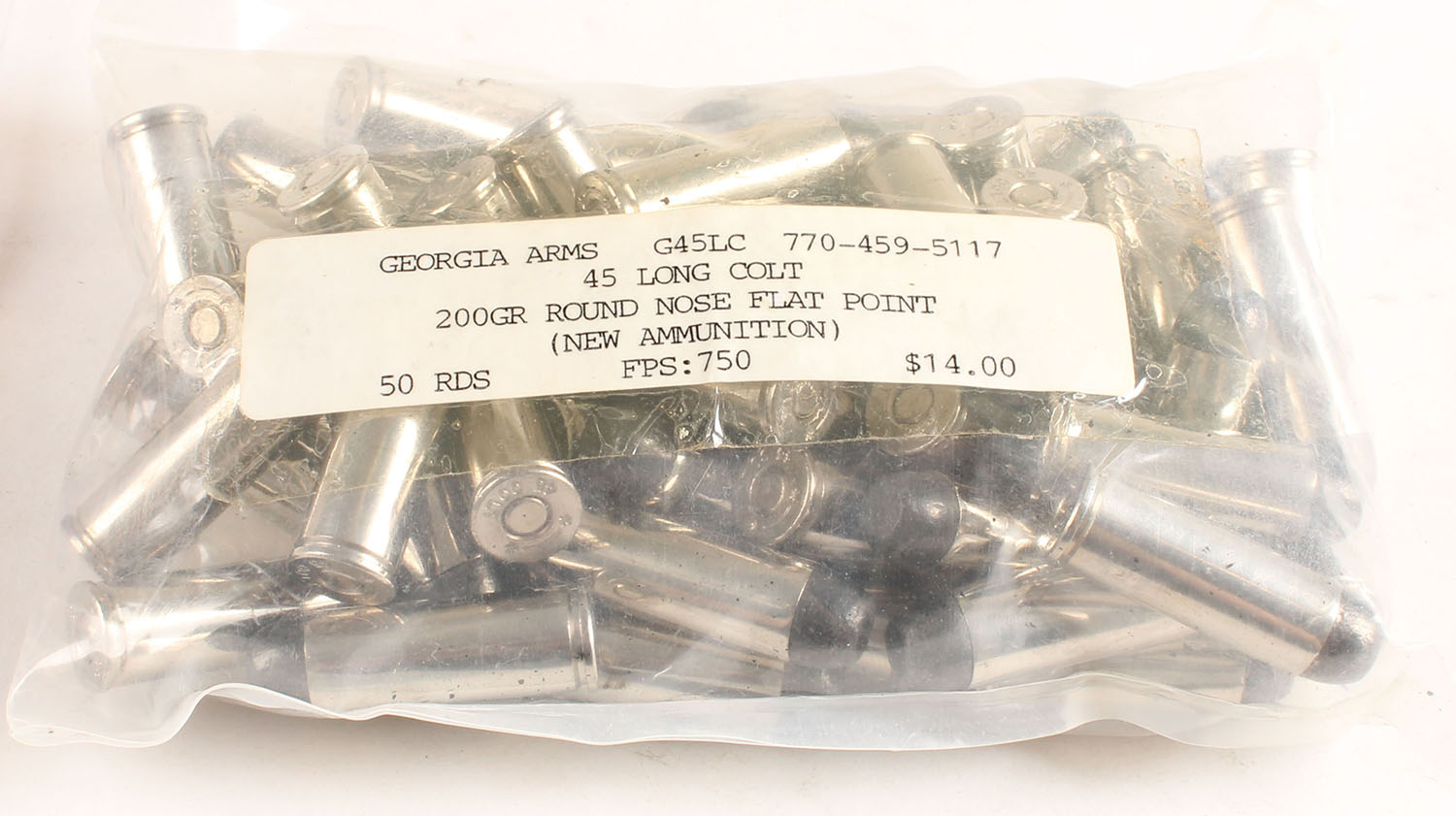 Georgia Arms, 45 Long Colt, 200 Gr. Round Nose Flat Point, Full 50 Rds. 1pc. Ammo is in sealed plastic bag, ammo is excellent. Grade: Excellent - Value: 10 to 100
