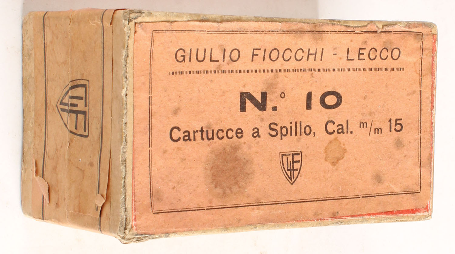 Fiocchi, 15mm Pinfire-Long, 2pc, Full, buff box with multi-color label, box is solid with very good color, age soiling, shelf wear, edge & corner wear, ammo is excellent. Grade: Very Good ++ - Value: 300 to 600