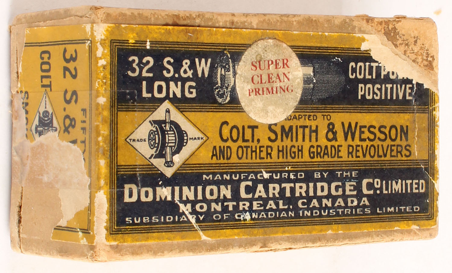 Dominion Cart Co., .32 S&W Long, Partial 46rds. Of mixed H.S., 2pc. Buff box with multi-color label, box is solid with fair to good color, age soiling, minor edge & corner wear, seam split to bottom, labels are 80% intact, ammo is good. Grade: Very Good - Value: 20 to 80