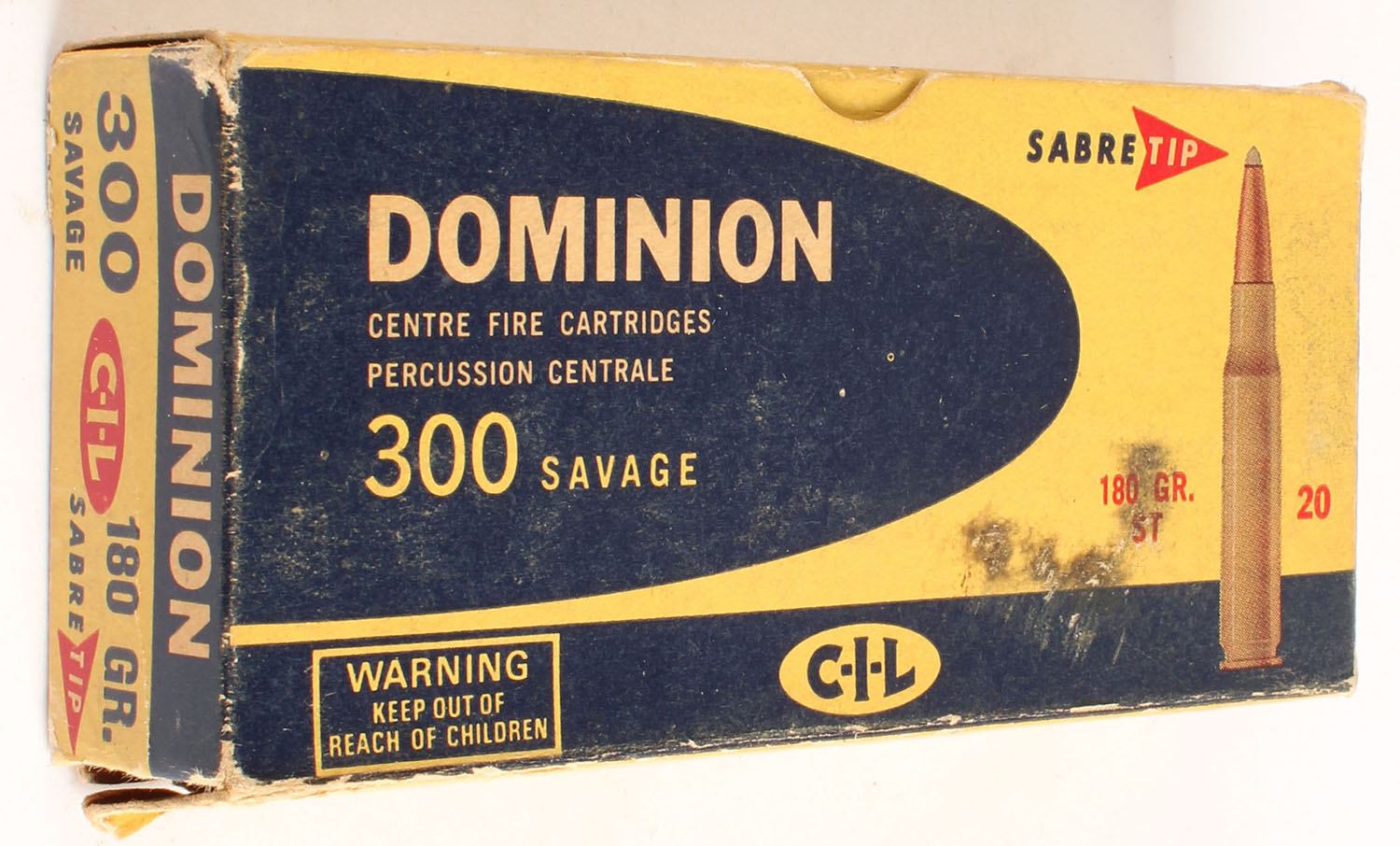 CIL, Dominion, 300 Savage, 180 Grain, Full, 1pc. Multi-colored box, box is solid with excellent color, has light shelf wear & light edge & corner wear, Ammo is excellent. Grade: Very Good ++ - Value: 20 to 60