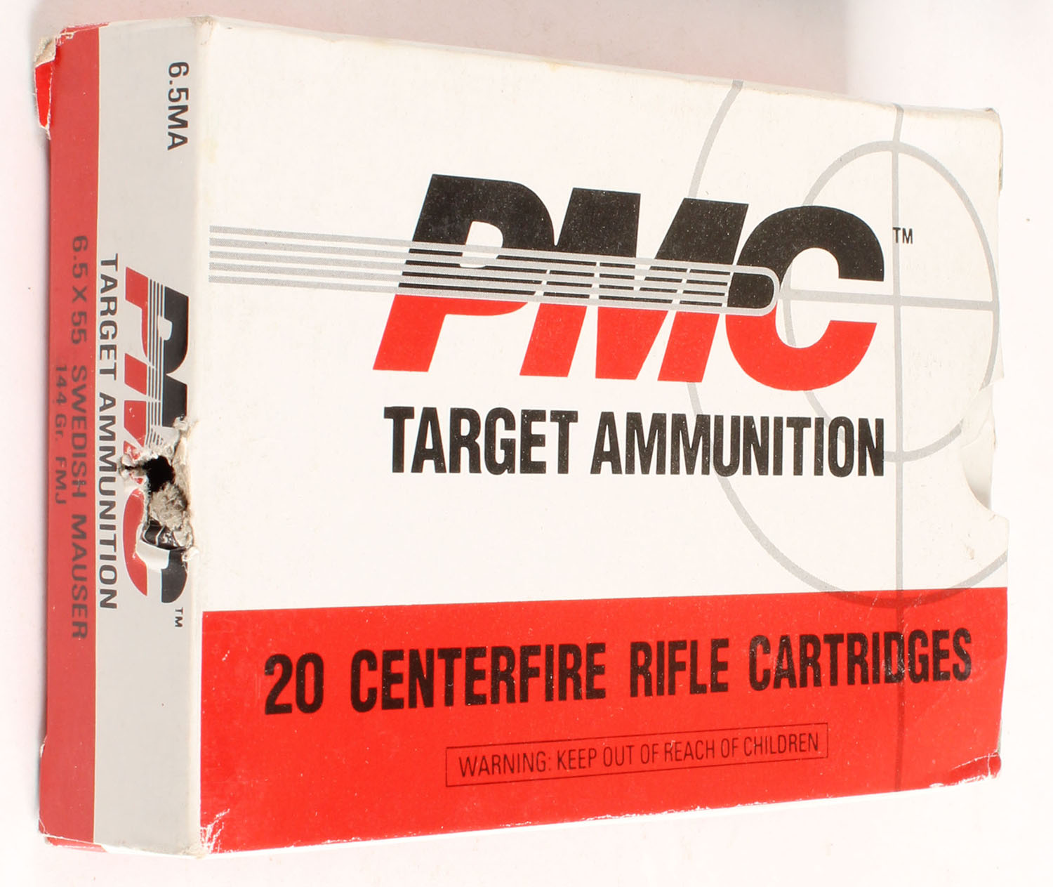 PMC, 6.5x55 Swedish Mauser, 144 Gr. FMJ, 1pc, Partial 19rds, white & red box with black print, box is solid, ammo is excellent. Grade: Very Good ++ - Value: 20 to 40
