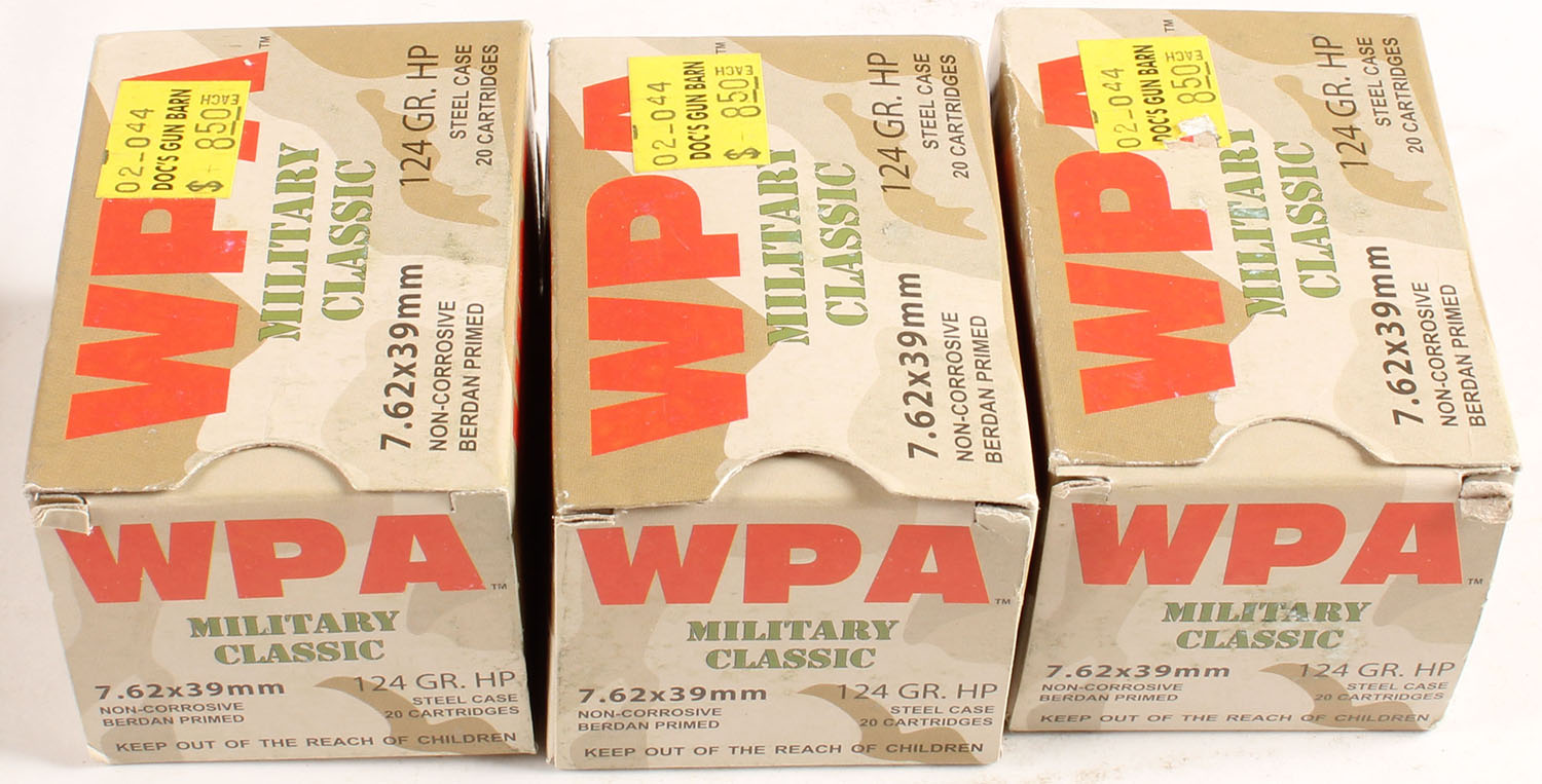 WPA, Lot of (3), Military Classic, 7.62x39 mm, 124 Grain Hollow Point, Steel Case, Full, boxes are excellent, ammo is minty. Grade: Excellent ++ - Value: 20 to 40