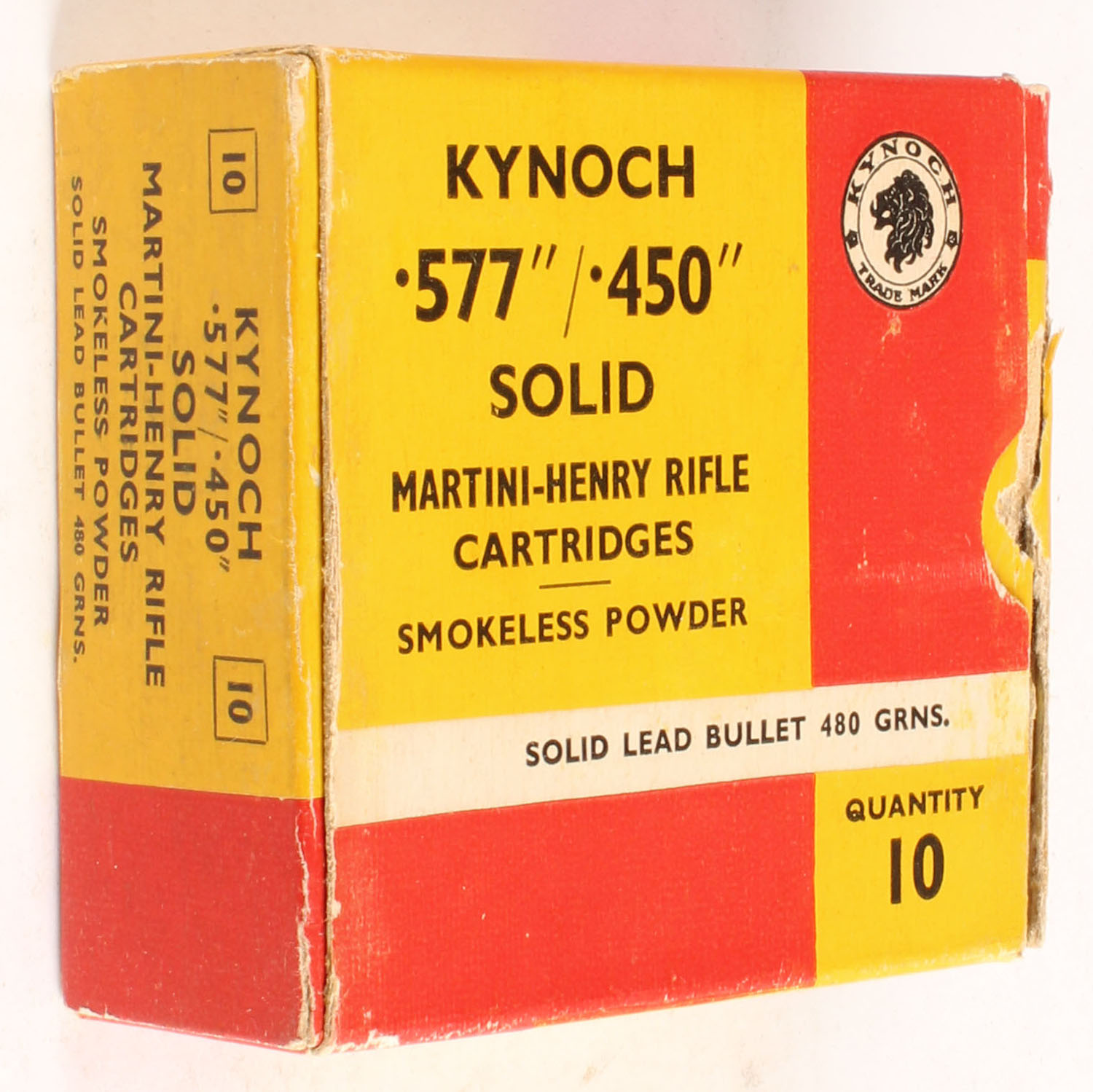 Kynoch, .577/.450 Solid Martini-Henry Riffle Cartridges, 480 Gr. Solid Lead, Full, 1pc. Multi-colored box, box is solid with excellent color, has seam split to right flap, Ammo is excellent. Grade: Excellent - Value: 30 to 90