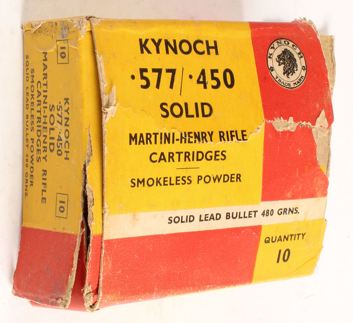 Kynoch, .577/.450 Solid Martini-Henry Riffle Cartridges, 480 Gr. Solid Lead, Full, 1pc. Multi-colored box, box is solid with good color, has soiling, right end flap is torn, Ammo is very good. Grade: Good ++ - Value: 30 to 60