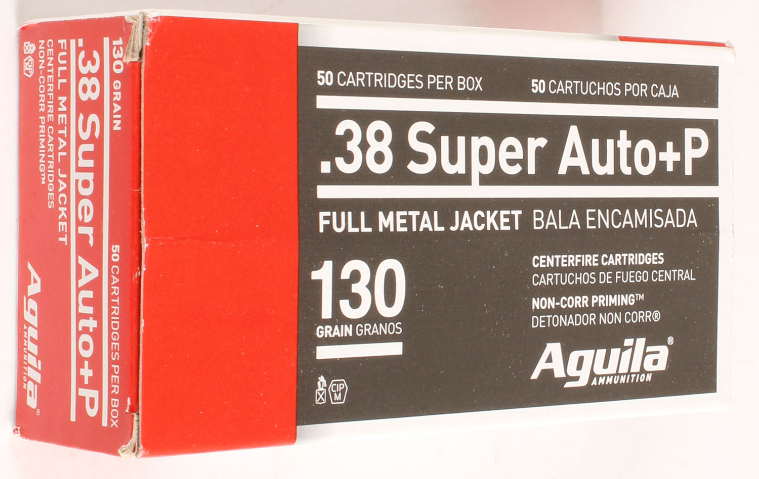 Aguila, .38 Super Auto +P, 130 Grain FMJ, Full, 1pc. Multi-colored box, box is solid with excellent color, Ammo is excellent. Grade: Excellent ++ - Value: 20 to 60