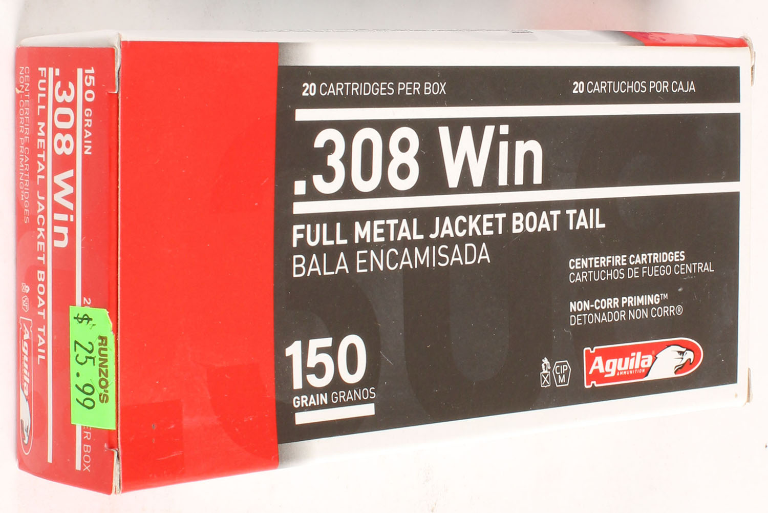 Aguila, .308 Winchester, 150 Grain Full Metal Jacket Boat Tail, Full, box is MINT with mint color, ammo is minty. Grade: MINT - Value: 16 to 40