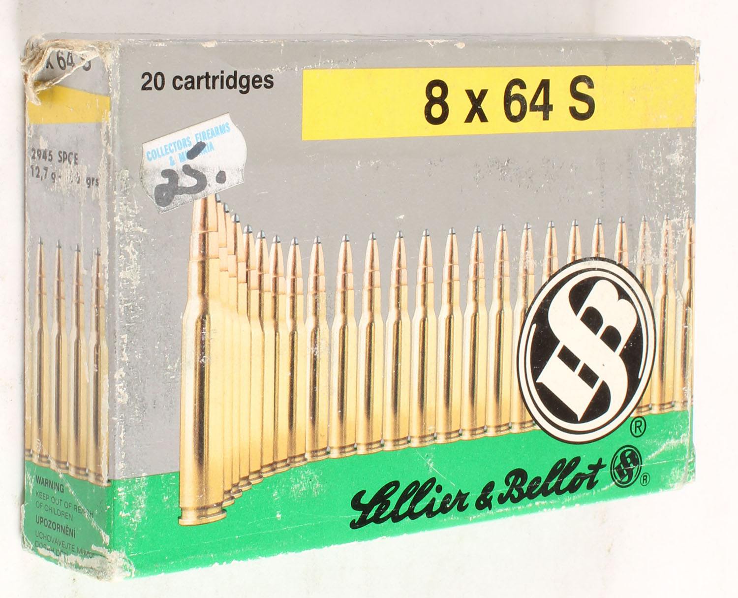 Sellier & Bellot, 8 x 64 S, 196 Grain Bullet, Full, 1pc. Silver green & yellow box, very good color, shelf wear, some edge & corner wear, end flaps are solid, ammo is excellent. Grade: Very Good - Value: 8 to 40