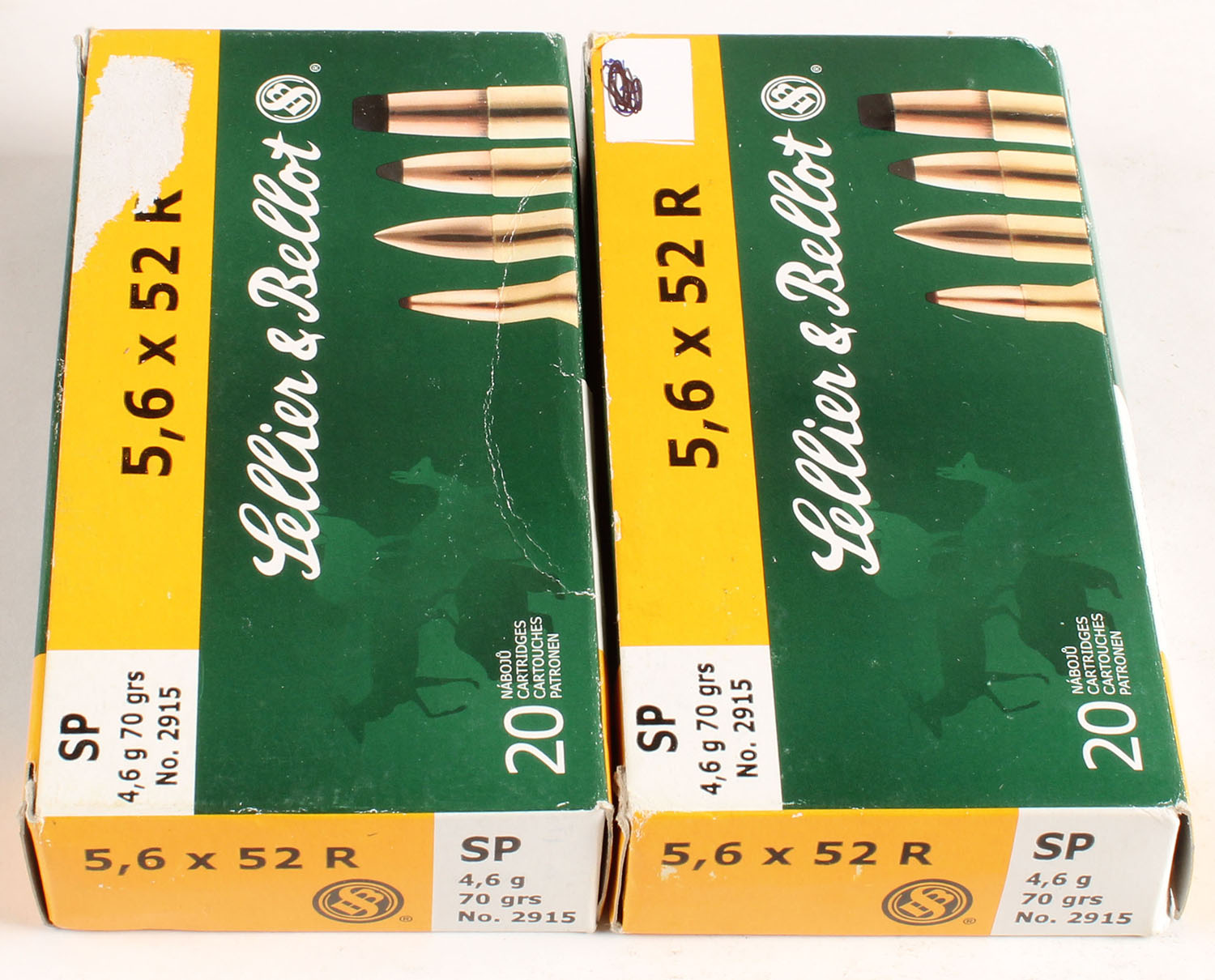 Sellier & Bellot, Lot of (2) 5.6 x 52 R, 80 Grain Bullet, (1) box full, (1) box partial 18rds., 1pc. Green yellow & white box, boxes are solid with excellent color, ammo is excellent. Grade: Excellent - Value: 20 to 60