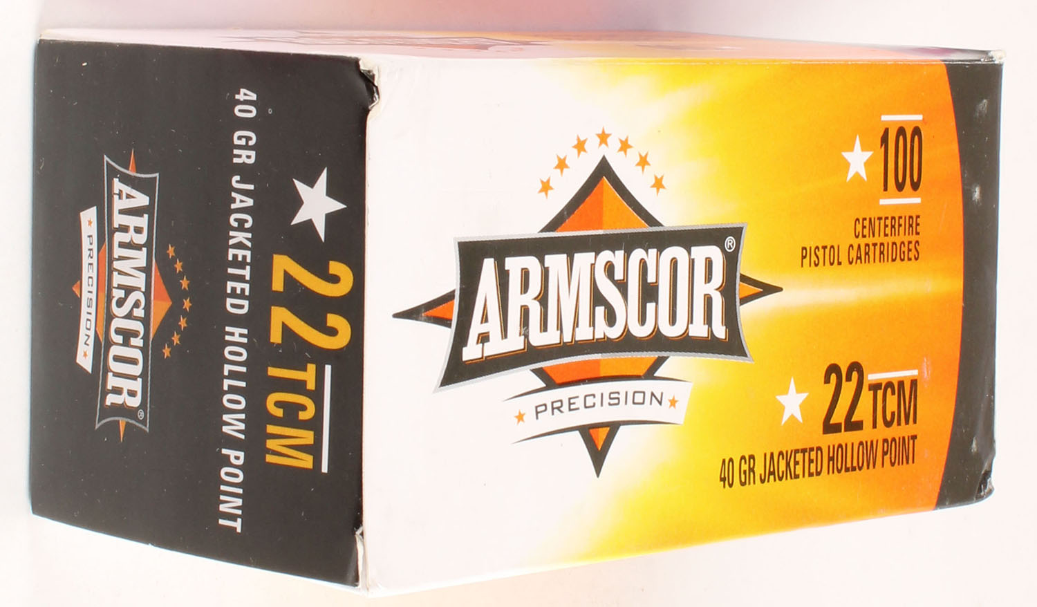 Armscor, .22 TCM, 40 Grain Jacketed Hollow Point, Full, 1pc. 100rds. Yellow white & black box, box is solid with excellent color, very minor shelf & corner wear, edges are crisp, end flap is solid, ammo is minty. Grade: Excellent ++ - Value: 10 to 50