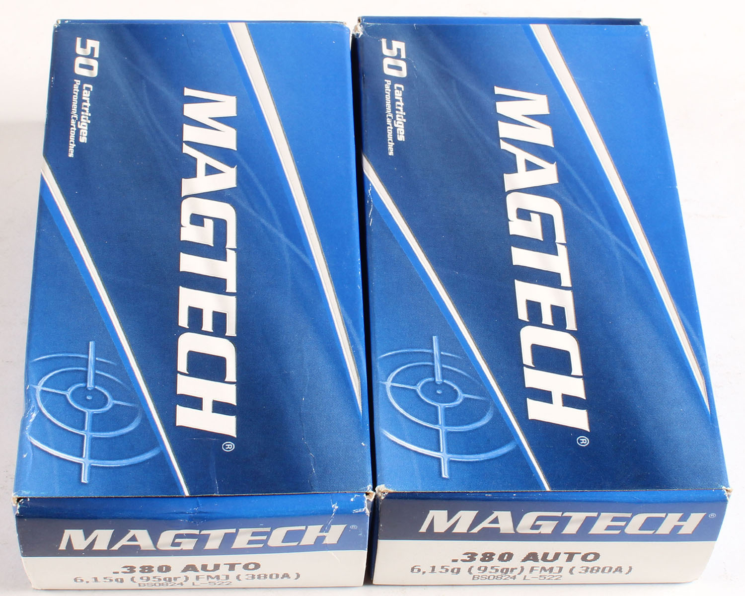 Magtech, Lot of (2), .380 Auto, 95 Grain FMJ, Full, 1pc. Blue boxes, boxes are near mint, ammo is minty. Grade: Excellent ++ - Value: 20 to 60