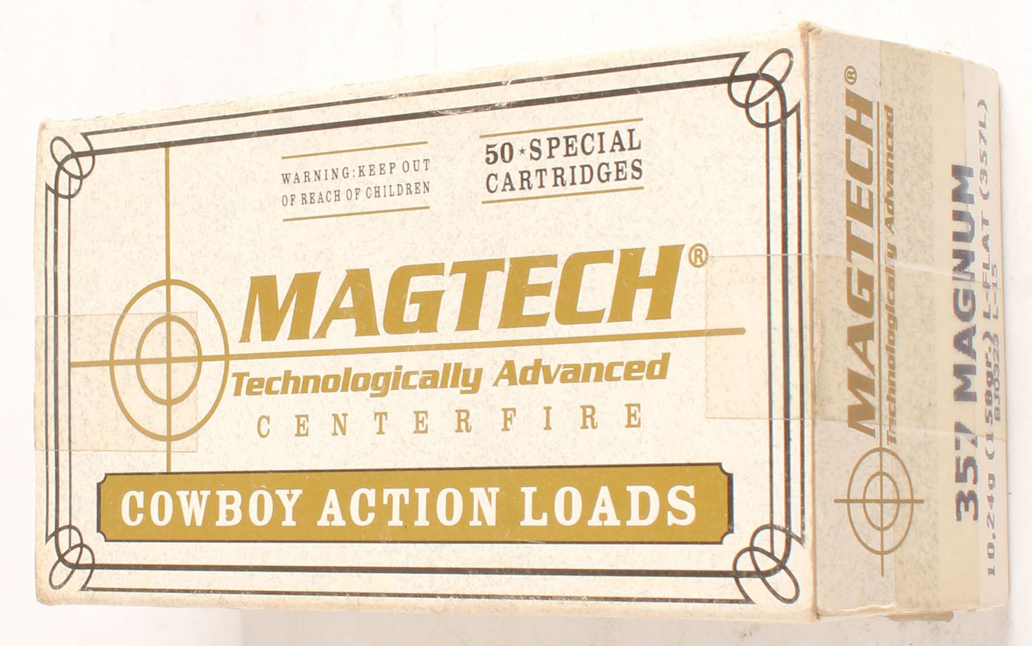 Magtech, .357 Magnum, 158 Grain L-Flat, Partial 35rds. 1pc. White box, box is solid with excellent color, tape on both ends, ammo is minty. Grade: Very Good ++ - Value: 8 to 40