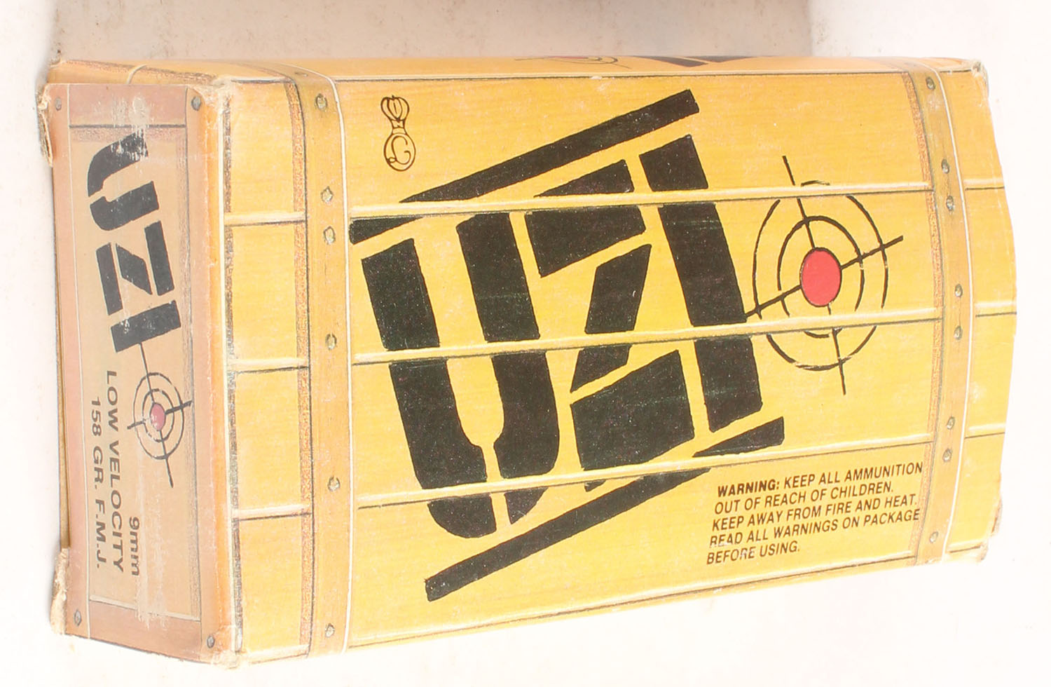 Uzi, 9mm H.V Carbine, (9mm x 19), 115 Grain FMJ, Full, 1pc. Brown box, box is solid with excellent color, ammo is minty. Grade: Excellent ++ - Value: 20 to 60