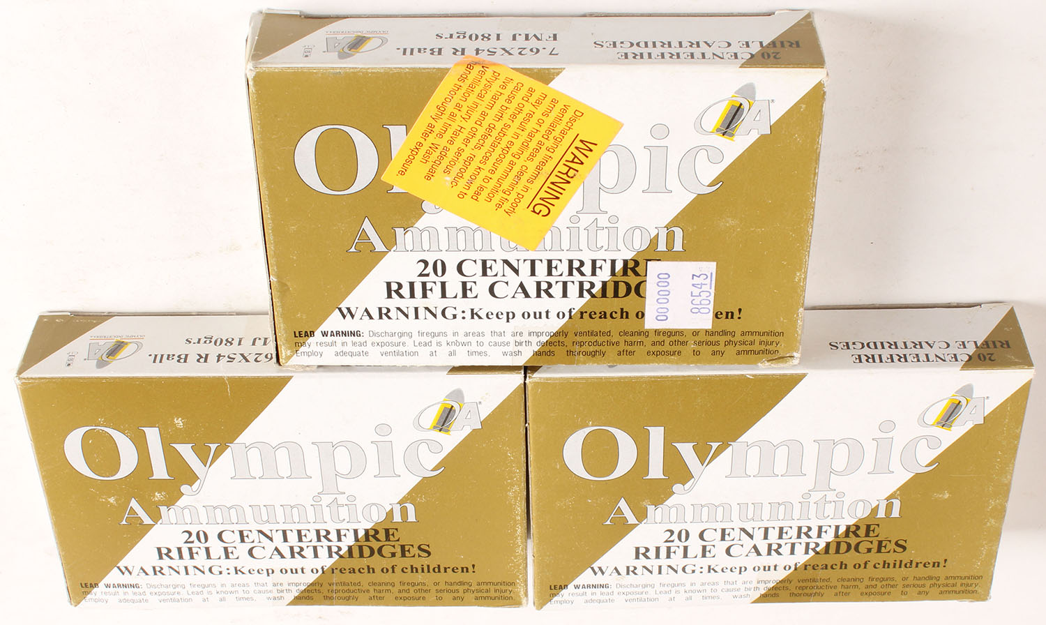 Olympic, Lot of (3), 7.62 x 54R, 180 Grain FMJ, Full, 1pc. White & gold boxes, boxes are solid with excellent color, ammo is minty. Grade: Excellent ++ - Value: 16 to 60