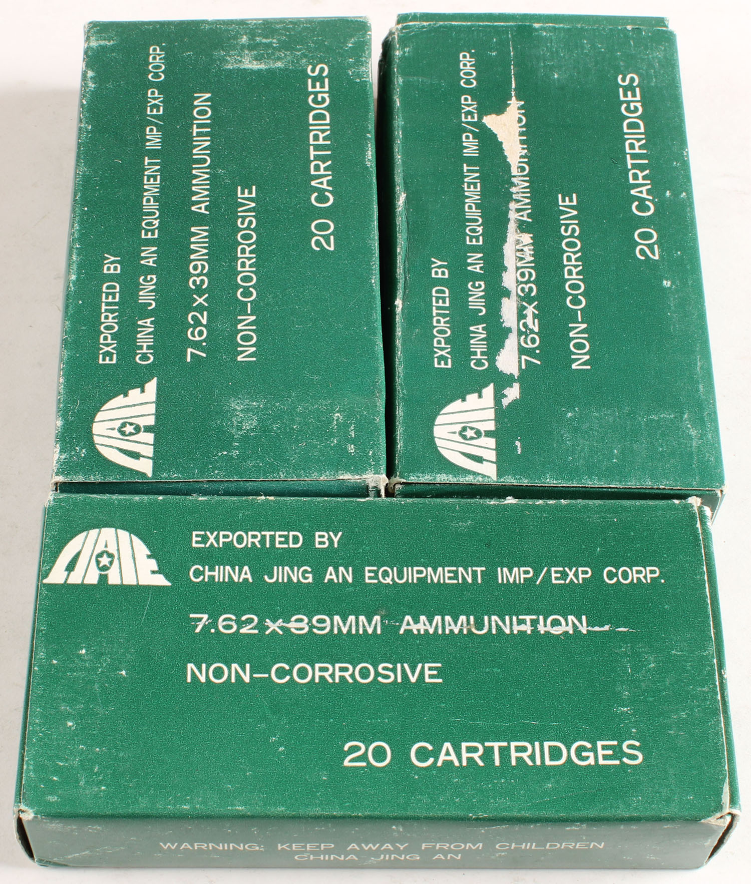 China Jing, Lot of (3), 7.62 x 39mm, Full, 1pc. Green boxes, boxes are solid with excellent color, ammo is minty. Grade: Excellent + - Value: 16 to 60