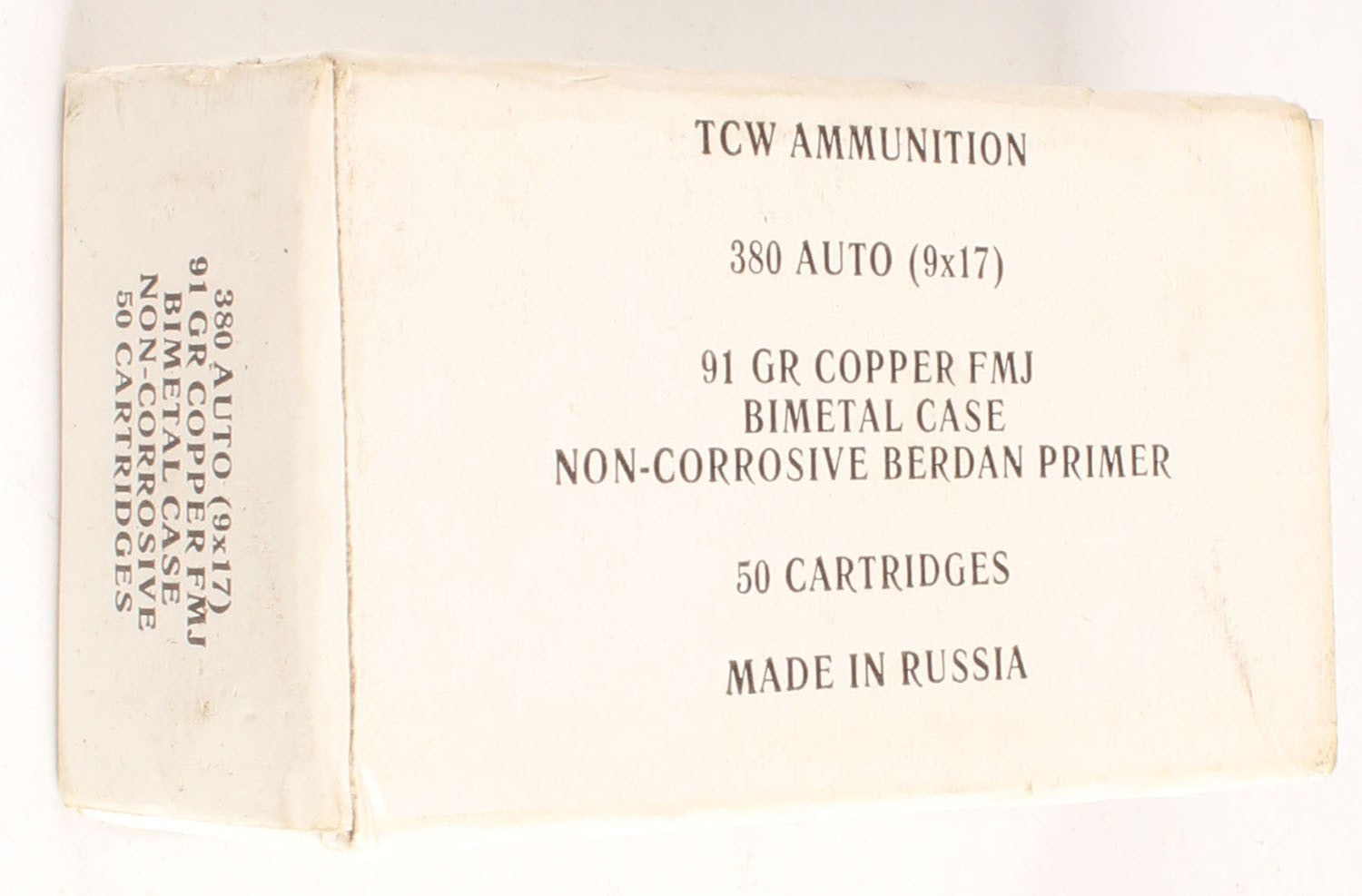 Unknown Russian Mfg., .380 Auto (9 x 17), 91 Grain Copper FMJ, Bimetal Case, Full, 1pc. White box, box is solid with excellent color, ammo is minty. Grade: Excellent ++ - Value: 8 to 40