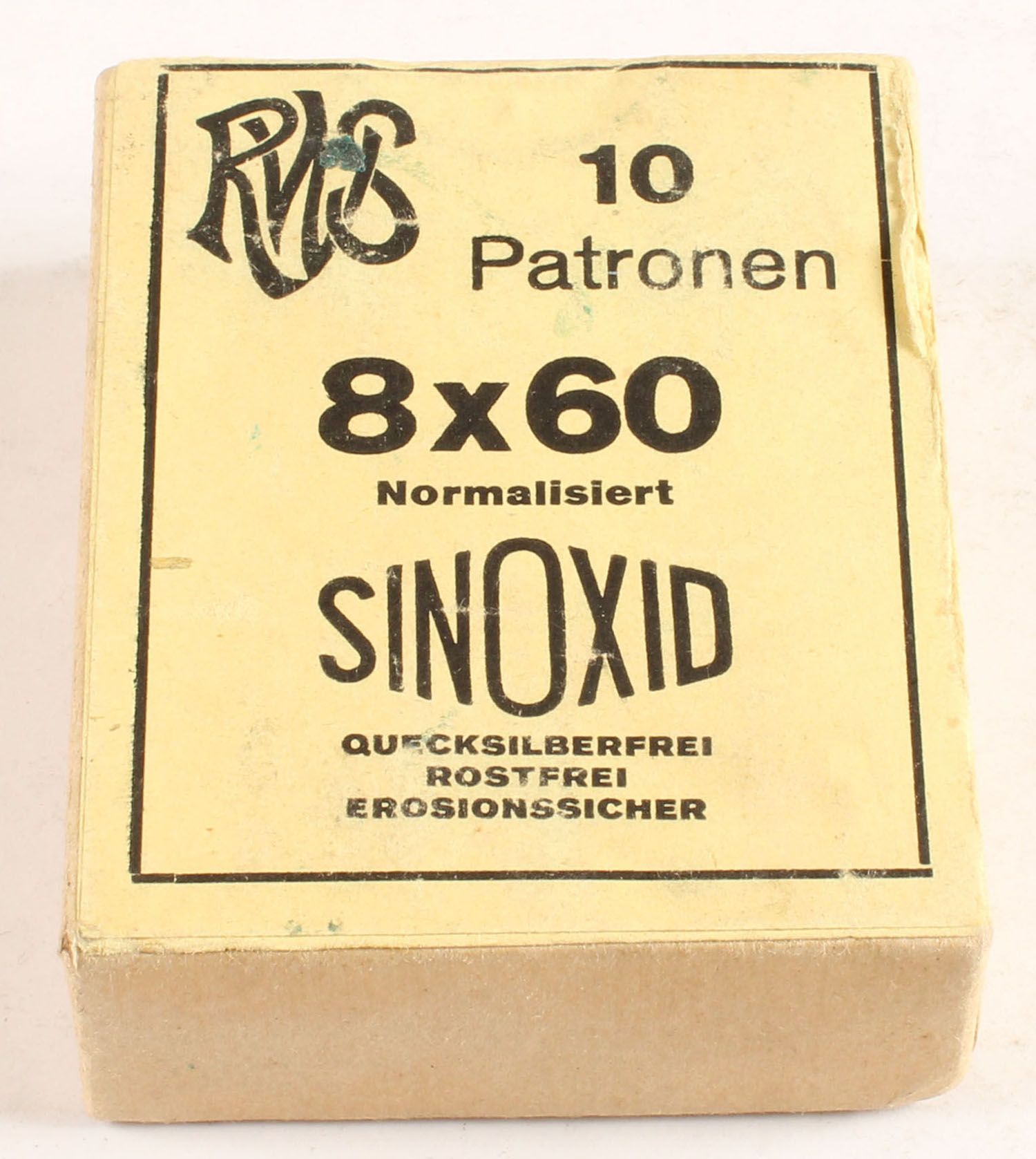 RWS, 8 x 60, 178 Grain Bullet, FULL & SEALED, 1pc. Buff box with yellow label, box is solid with excellent color, very minor age soiling, some edge & corner wear, label is intact. Grade: Excellent - Value: 8 to 40