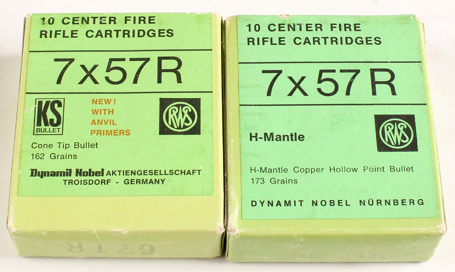 RWS, Lot of (2), 7 x 57 R, 162 Grain Cone Tip Bullet, (1) box full, (1) box partial 9rds., 1pc. Green boxes, boxes are solid with excellent color, ammo is excellent. Grade: Excellent - Value: 16 to 60