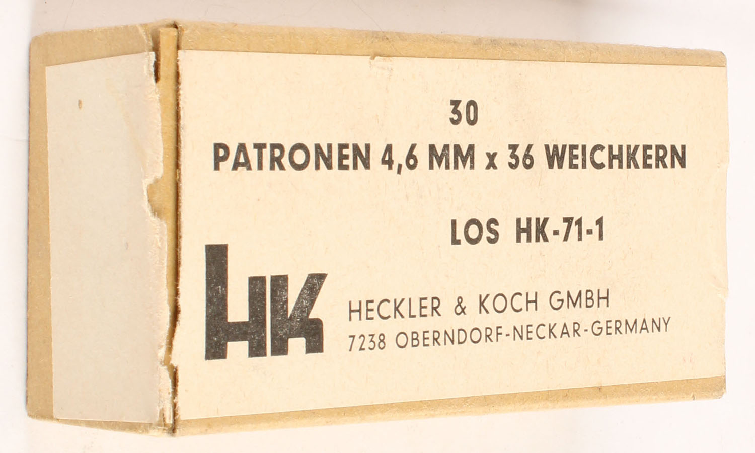 Heckler & Koch, .4.6 x 36mm, Soft Core, Full, 1pc. Buff box with white sealing label, box is solid with very good to excellent color, some age soiling, very minor corner wear, edges are crisp, end flaps are solid, ammo is excellent. Grade: Excellent - Value: 20 to 100