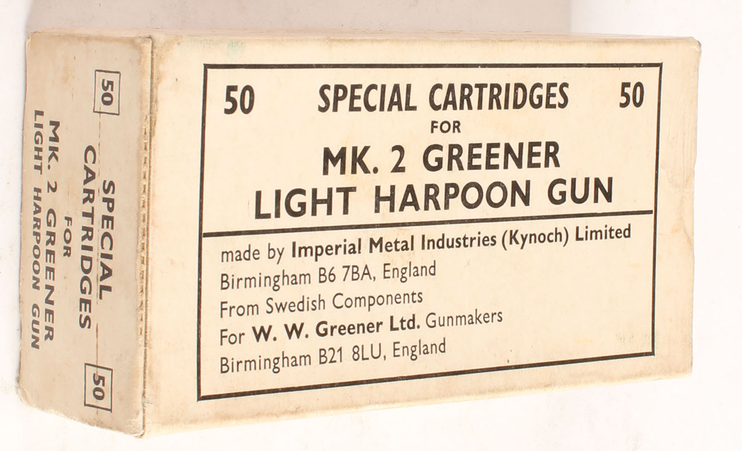 IMI, Special Cartridges for MK. 2 Greener Light Harpoon Gun, Full, 1pc. White & black box, box is solid with excellent color, very minor age soiling & corner wear, edges are crisp, end flaps are solid, ammo is excellent. Grade: Excellent + - Value: 20 to 200