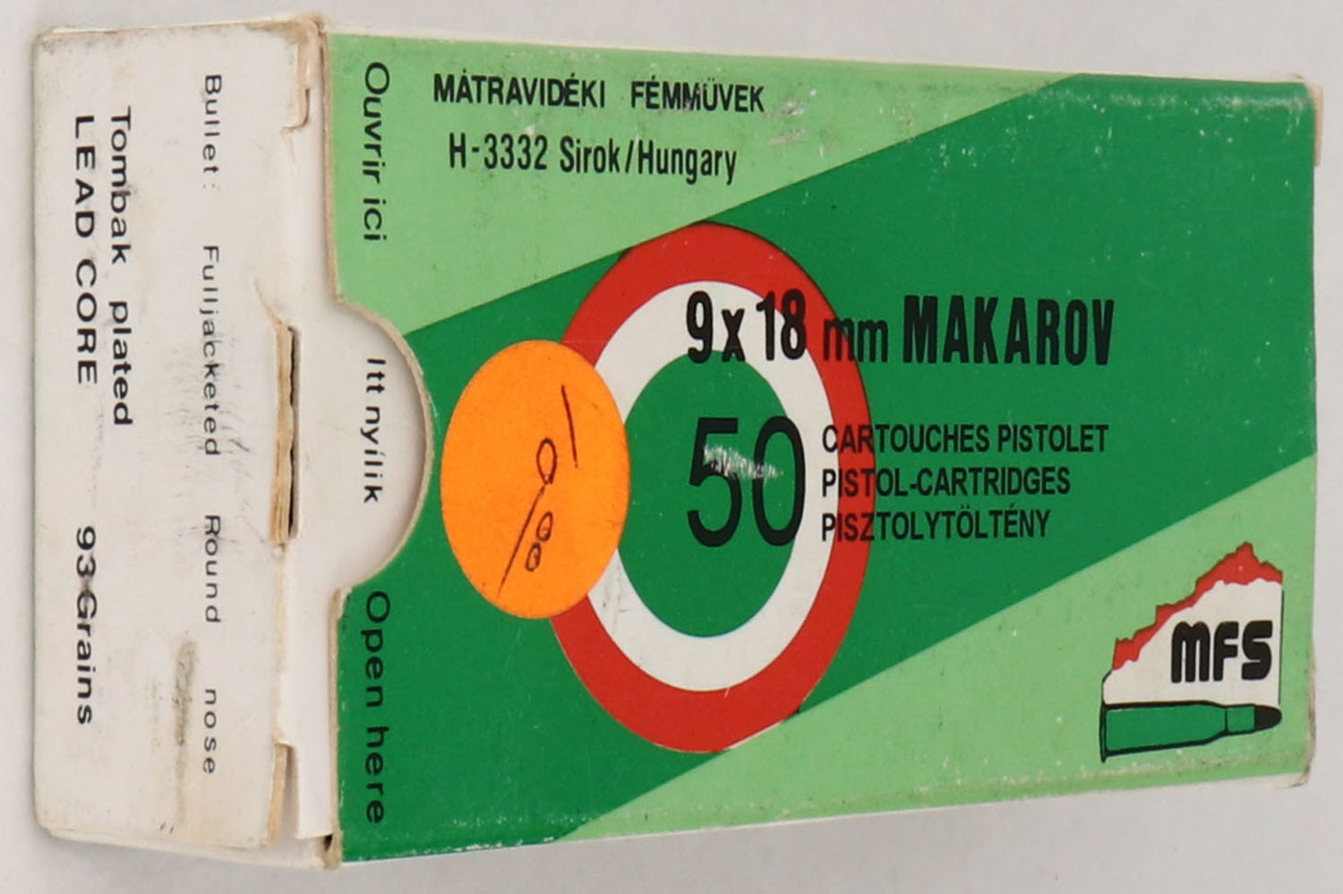 MFS, 9 x 18mm Makarov, 93 Grain Lead Core, Full, 1pc. Green & white box, box is solid with excellent color, top has been written on, ammo is minty. Grade: Excellent - Value: 10 to 40