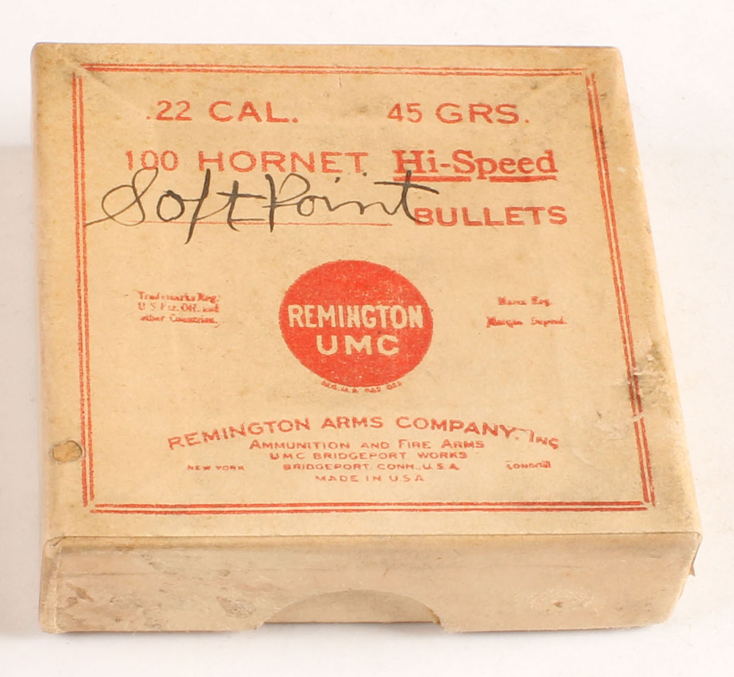 REM-UMC, .22 Cal. 45 Grs. 100 Hi-Speed Soft Point Bullets, FULL & SEALED, 2pc. Buff box with buff & red wraparound label, box is solid with excellent color, minor age soiling, corners are mostly sharp, edges are crisp, label is intact. Grade: Excellent - Value: 20 to 80
