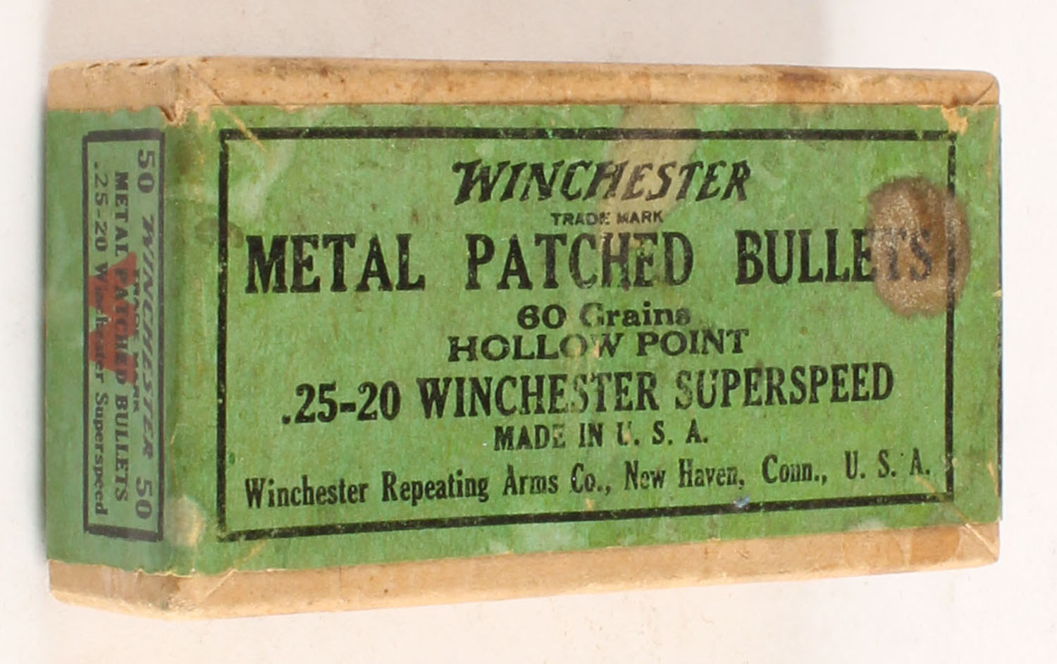 Winchester, Metal Patched Bullets, .25-20 Winchester Superspeed, 60 Grains Hollow Point, Full, 2pc. Buff box with green wraparound label, box is solid with excellent color, minor staining & shelf wear, corners are mostly sharp, edges are mostly crisp, bullets are excellent. Grade: Excellent - Value: 20 to 60