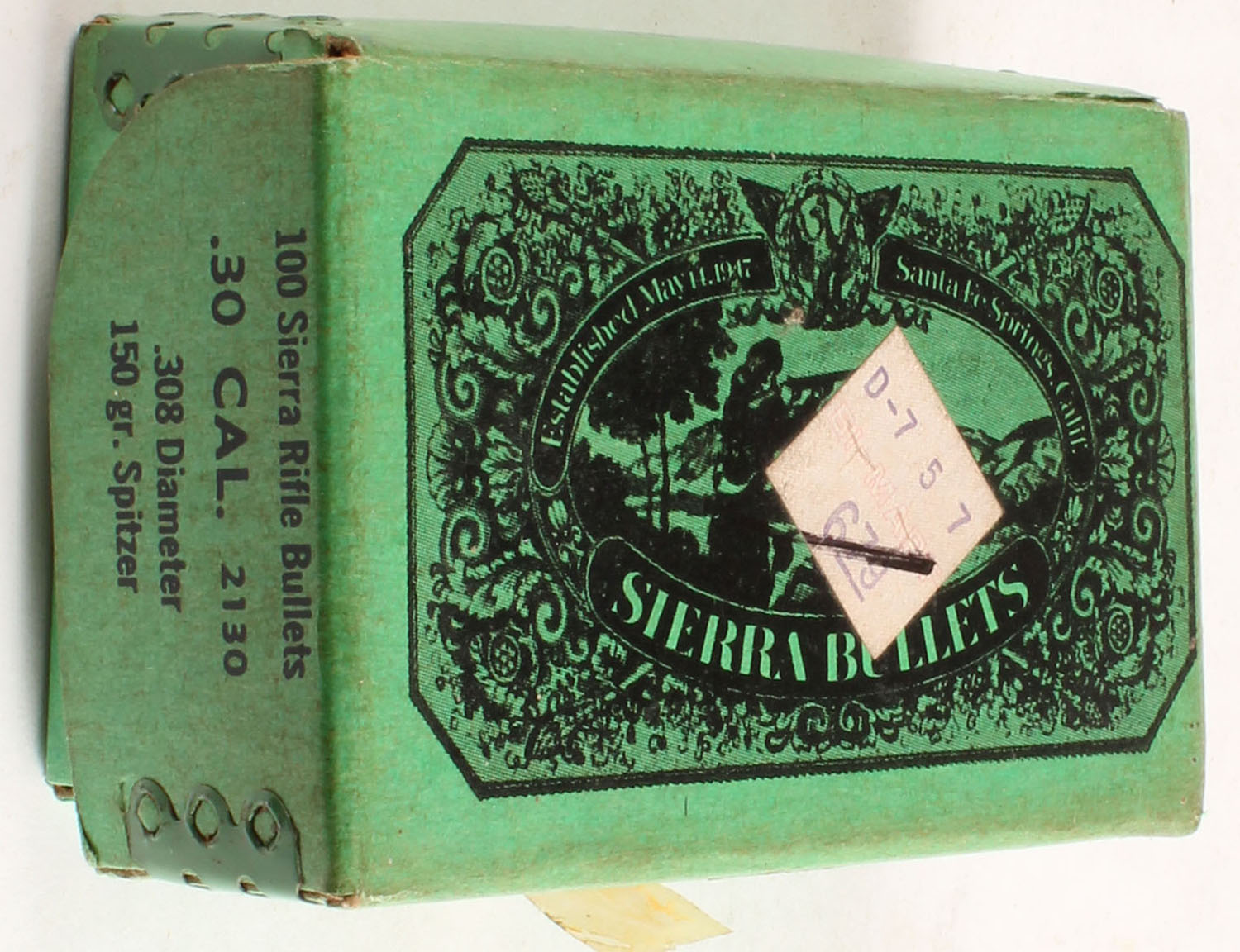 Sierra, .30 Caliber, 150 Grain Spitzer, .308'' Dia., Full, 1pc. Green box, box is solid with excellent color, bullets are minty. Grade: Excellent - Value: 12 to 40
