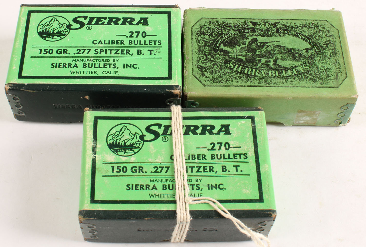 Sierra Bullets, Lot of 3, 270 Cal, .277'' Spitzer, 150 Gr., 2pc, (1) box Full & Sealed (2) box is Full, (3) box is Partial. Grade: Very Good ++ - Value: 20 to 60