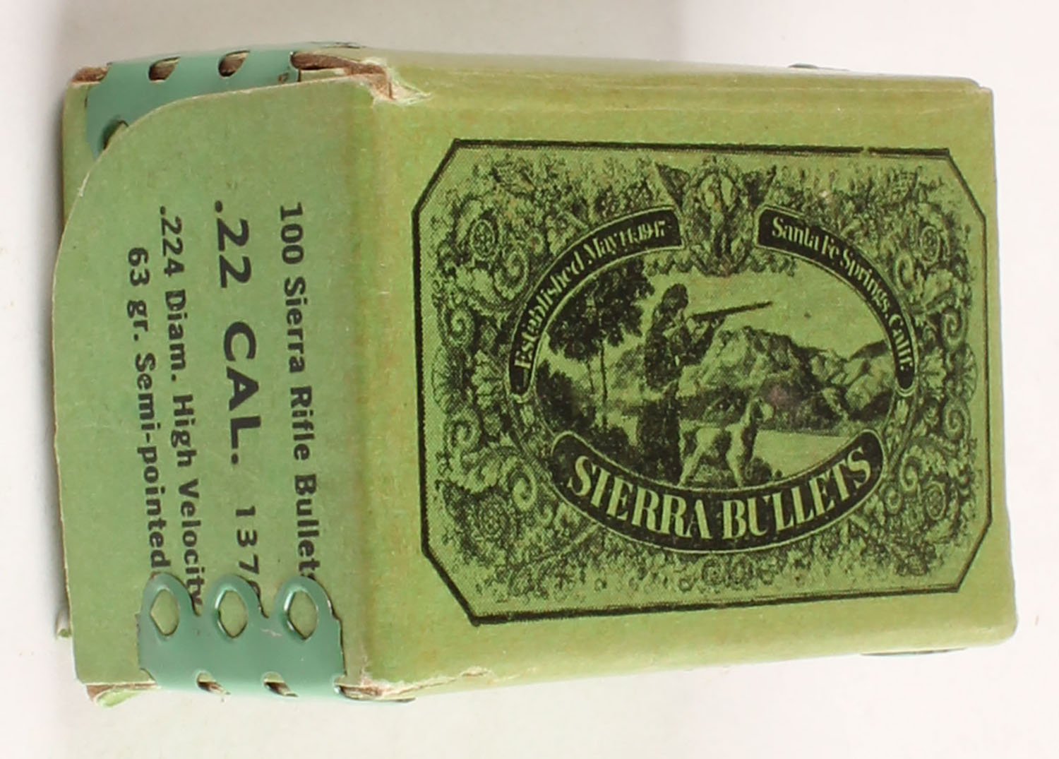 Sierra, 22 Cal., 63 Gr. Semi-Pointed, Full with Insert, 1pc., green box, box is solid with excellent color, bullets are excellent. Grade: Excellent - Value: 10 to 40