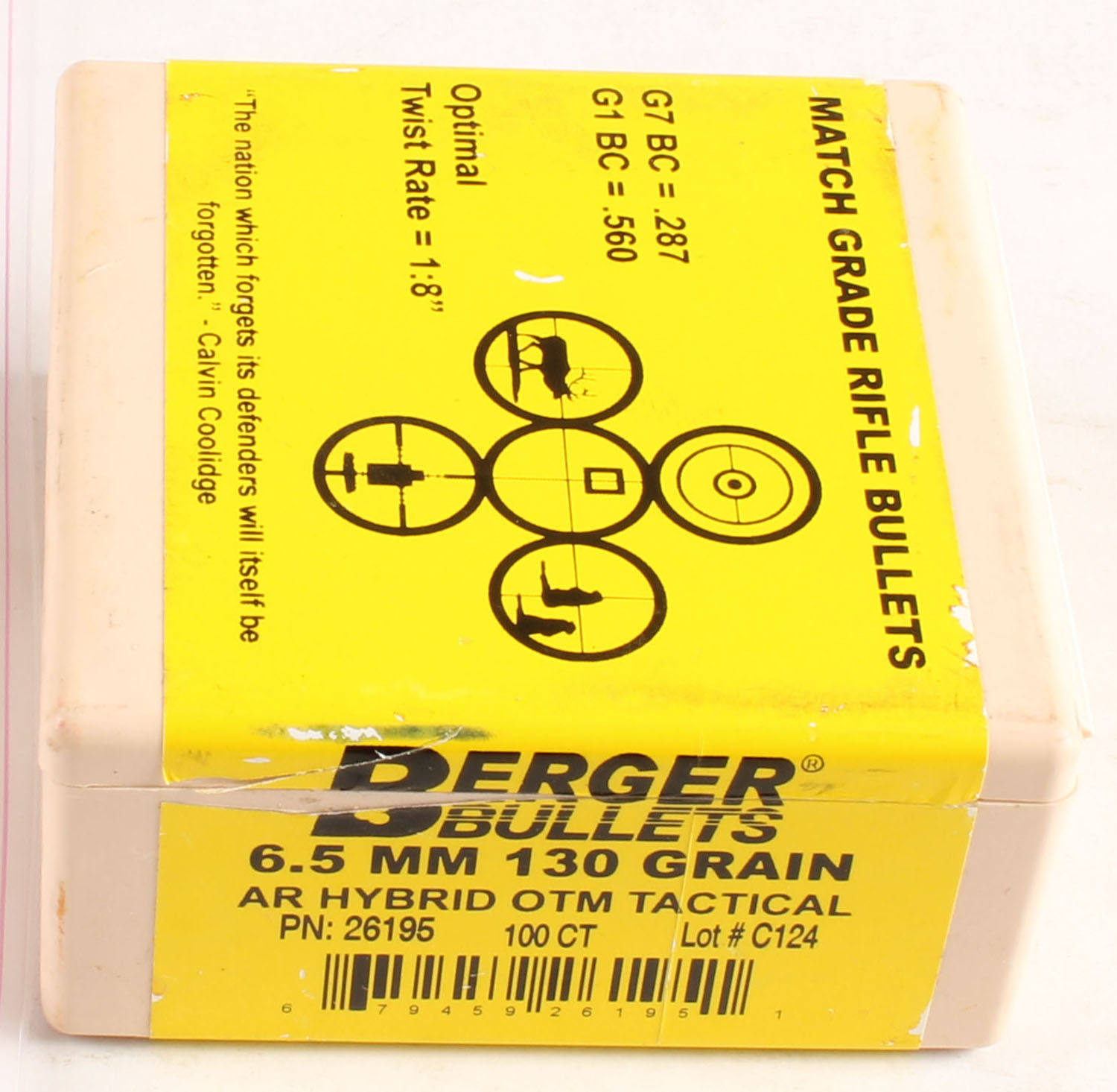 Berger, AR Hybrid OTM Tactical, 6.5mm, 130 GR., Full, 1pc. Yellow plastic box, box is solid with excellent color, some shelf wear. Grade: Excellent ++ - Value: 10 to 50