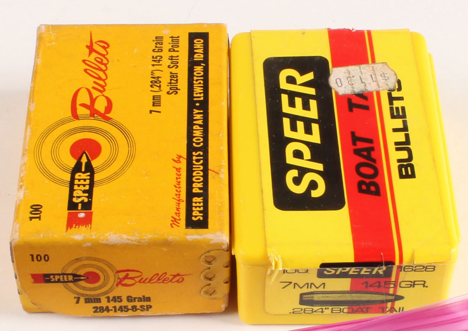 Speer, Lot of 2, 7mm, 145 Gr., .284'' Boat Tail, 1 box is Full the other is Partial, Yellow boxes with multi-colored label, boxes are solid with age soiling, labels are intact. Grade: Very Good ++ - Value: 20 to 60