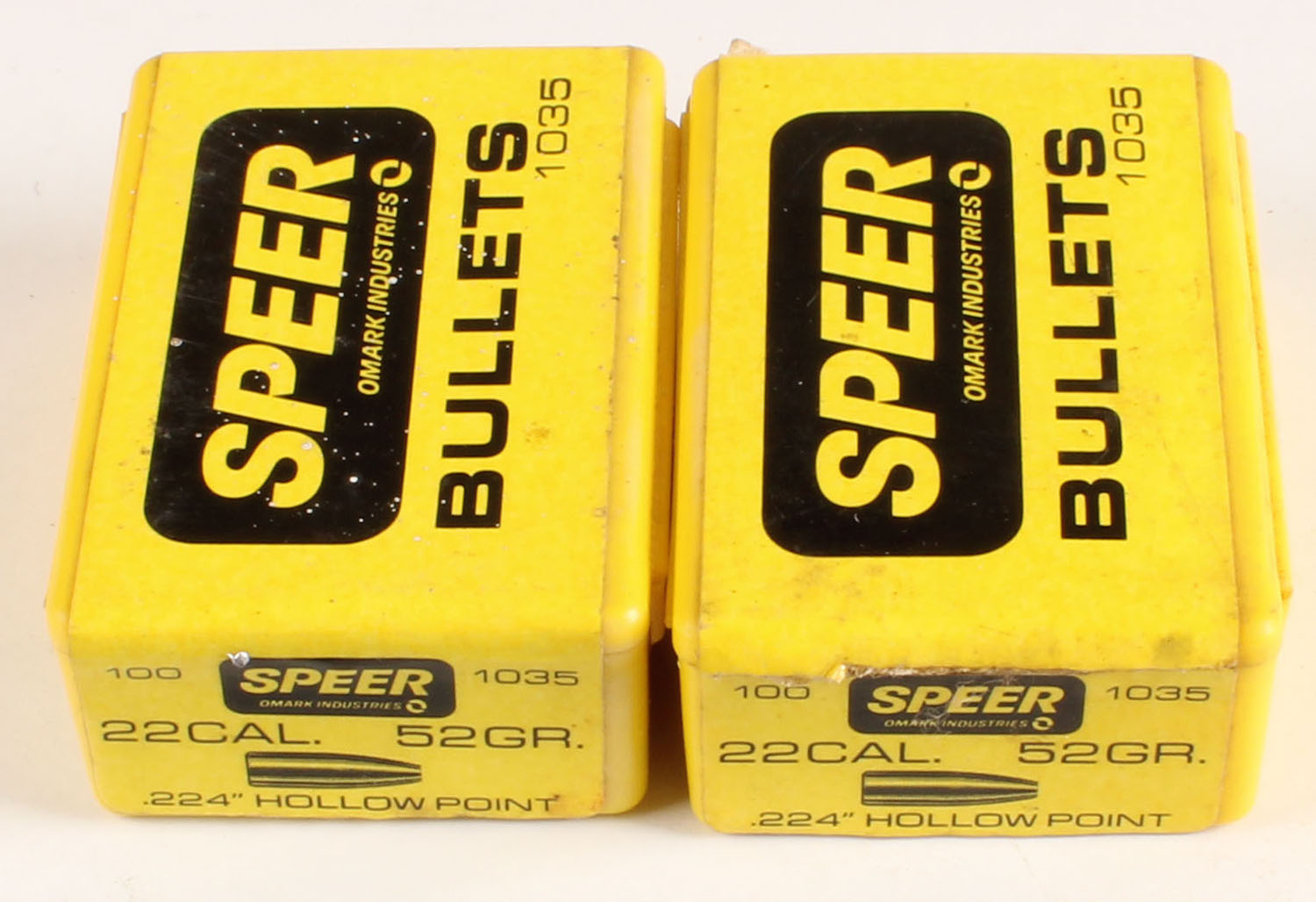 Speer, Lot of 2, .22 Cal., 52 Grain Hollow Point, .224 Dia., Full & Sealed & Partial approx. 3/4 full, 1pc. Yellow plastic boxes with black gray & yellow, boxes are solid with excellent color, label is intact, bullets are minty. Grade: Very Good ++ - Value: 20 to 60